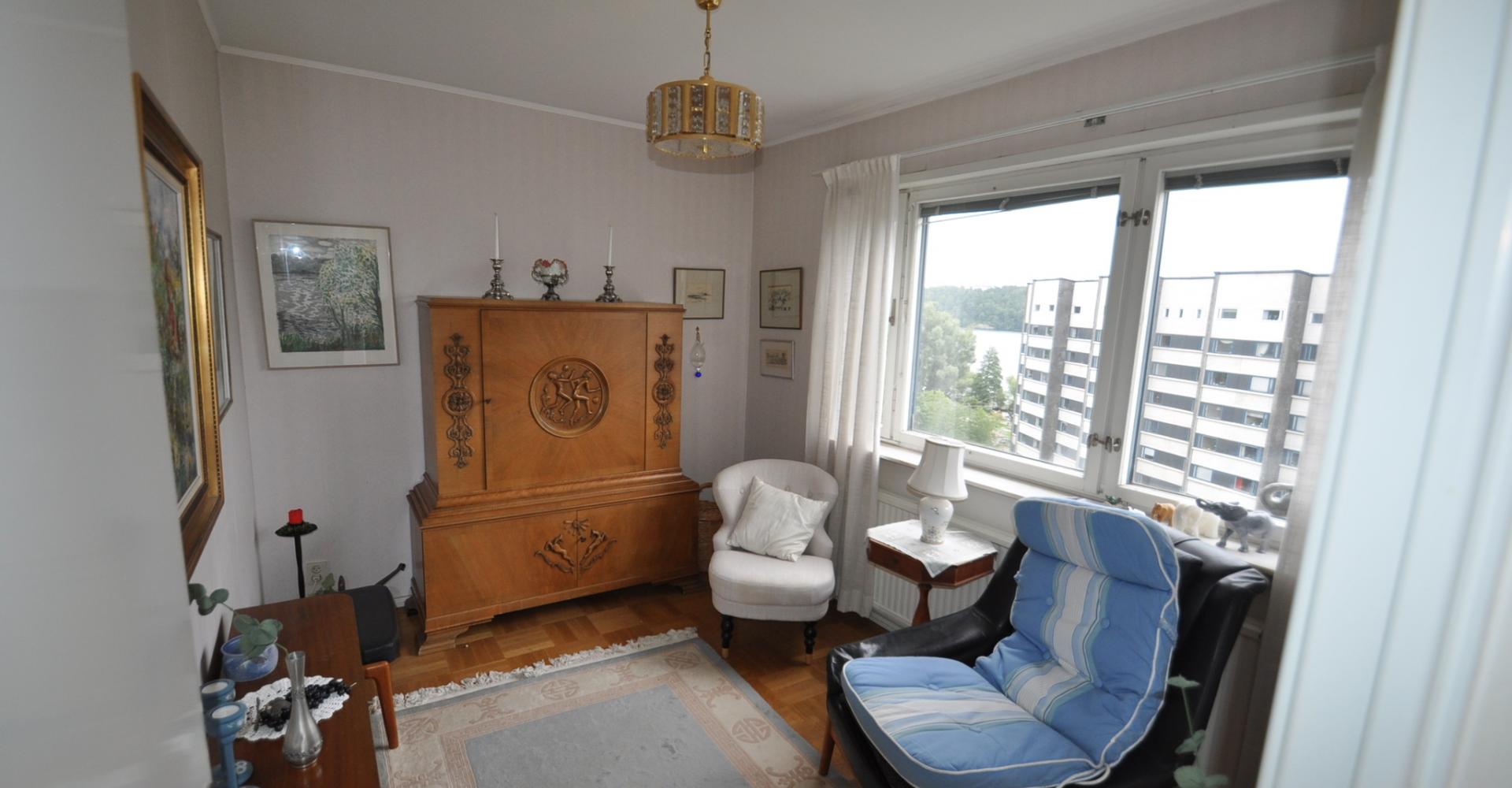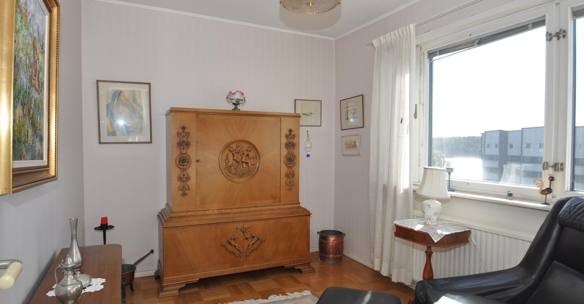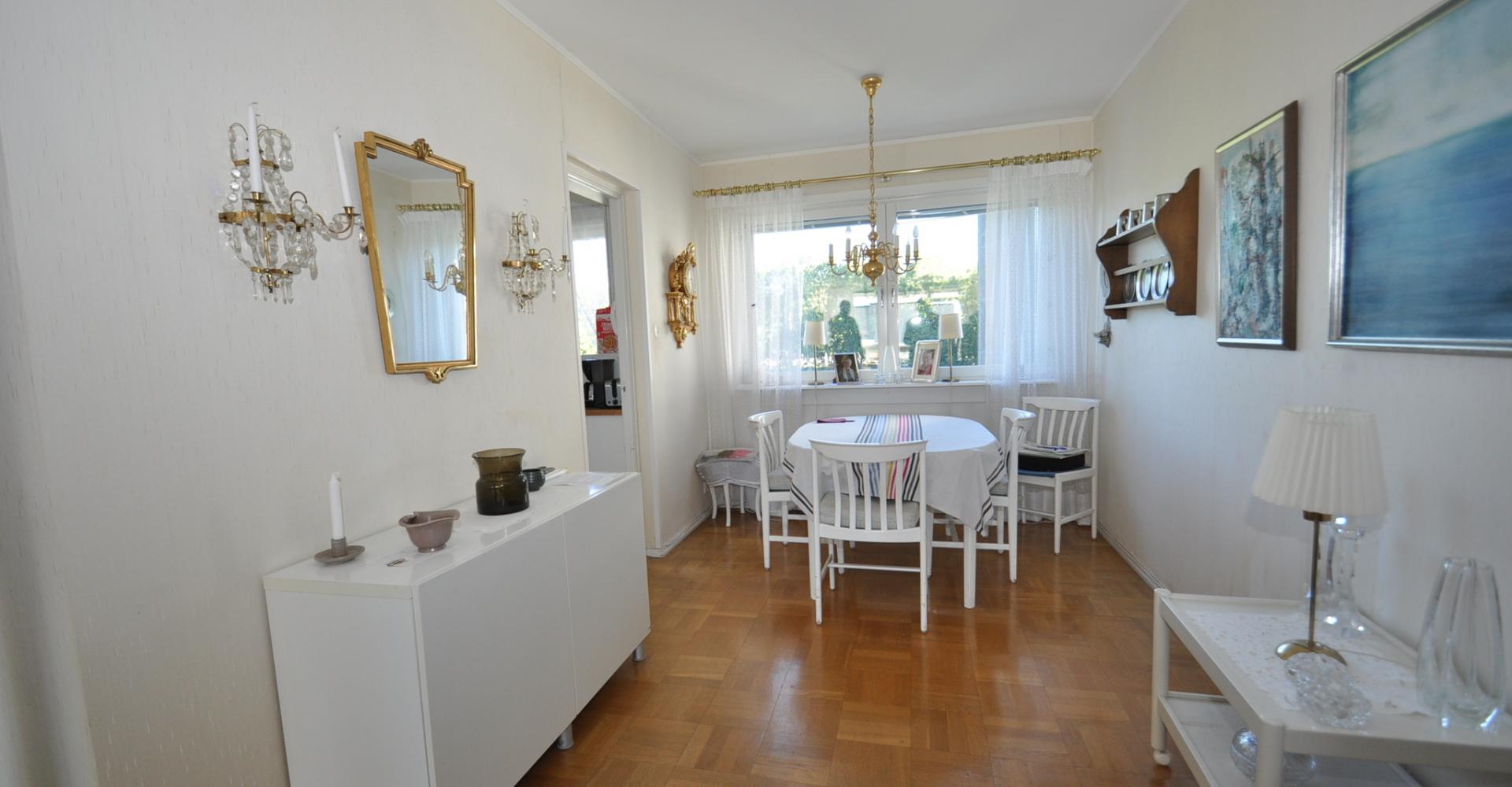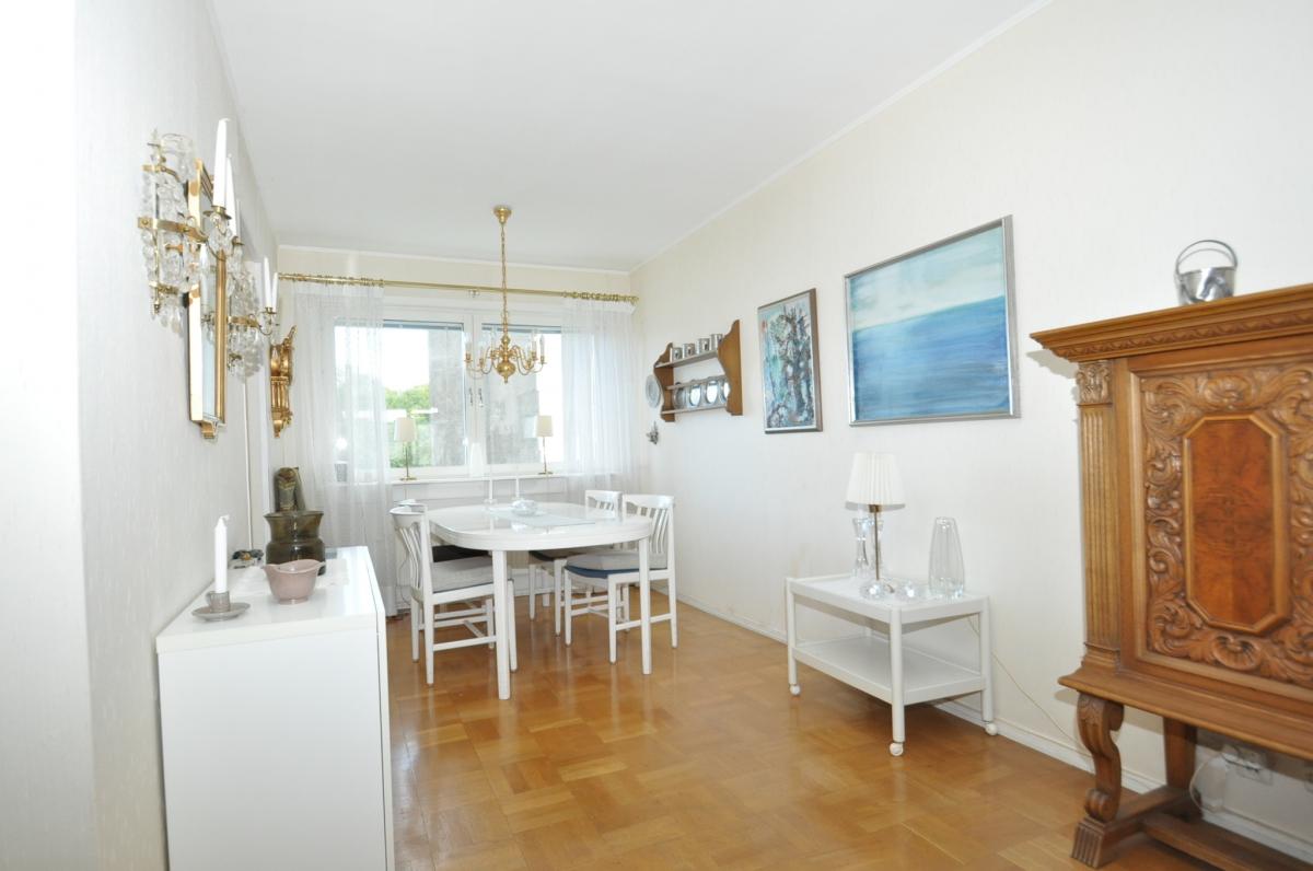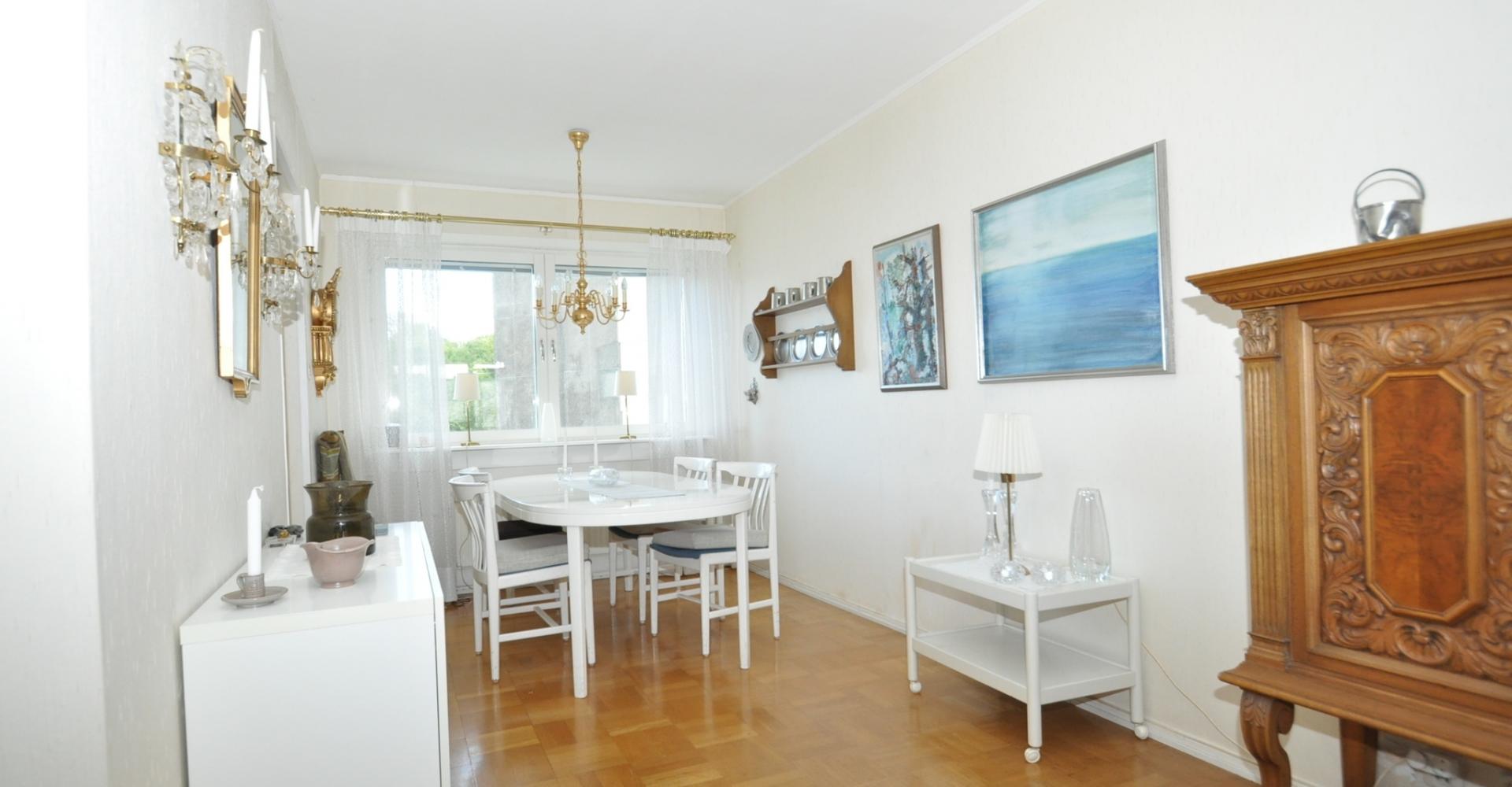 Vardagsrum: stort med ljusinsläpp från två håll, ljusa tapeter, parkettgolv, utgång till balkongen. Balkongen har markis samt infravärme.