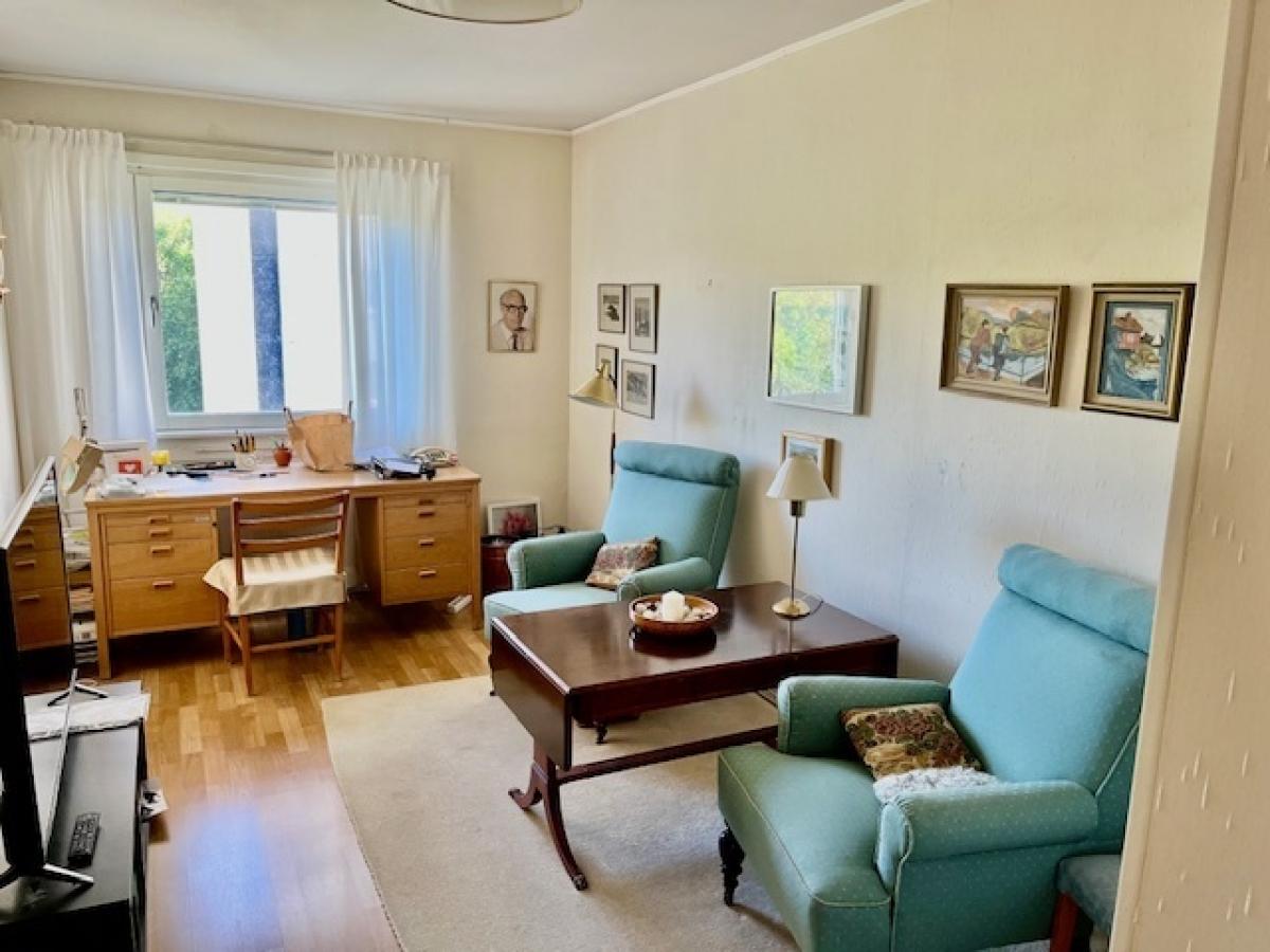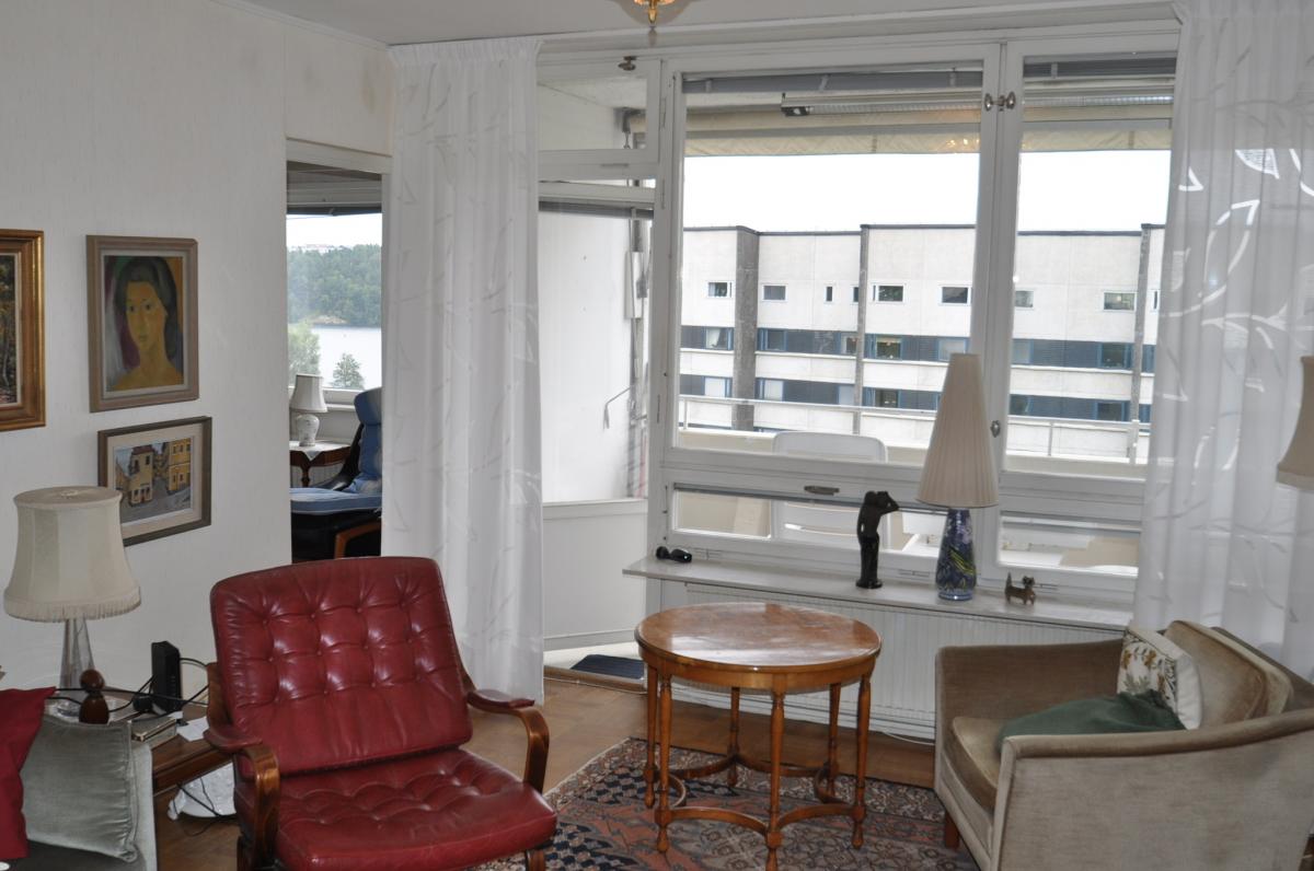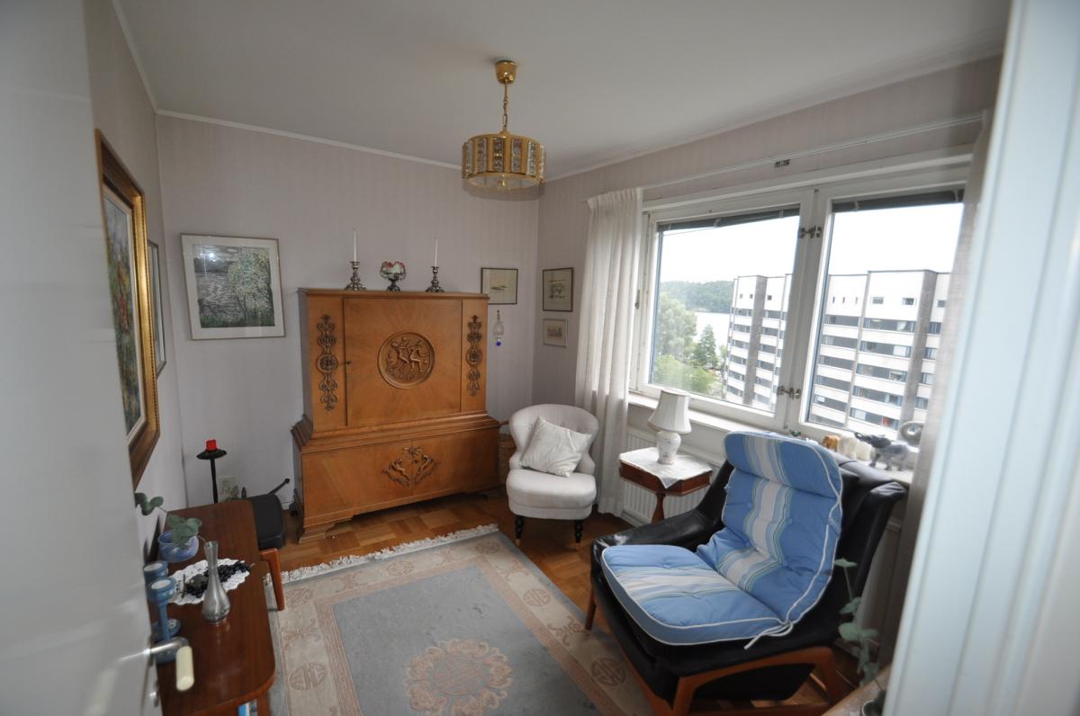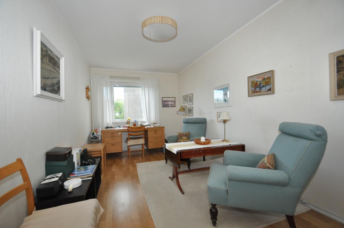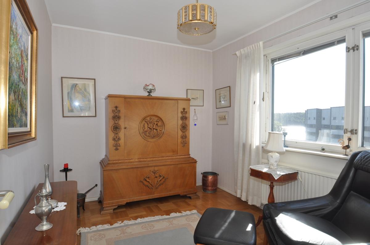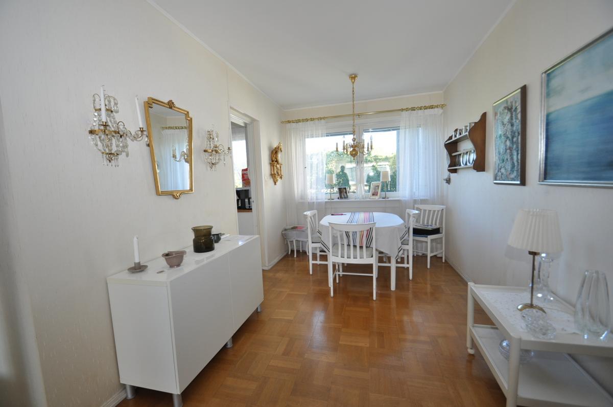 Vardagsrum: stort med ljusinsläpp från två håll, ljusa tapeter, parkettgolv, utgång till balkongen. Balkongen har markis samt infravärme.