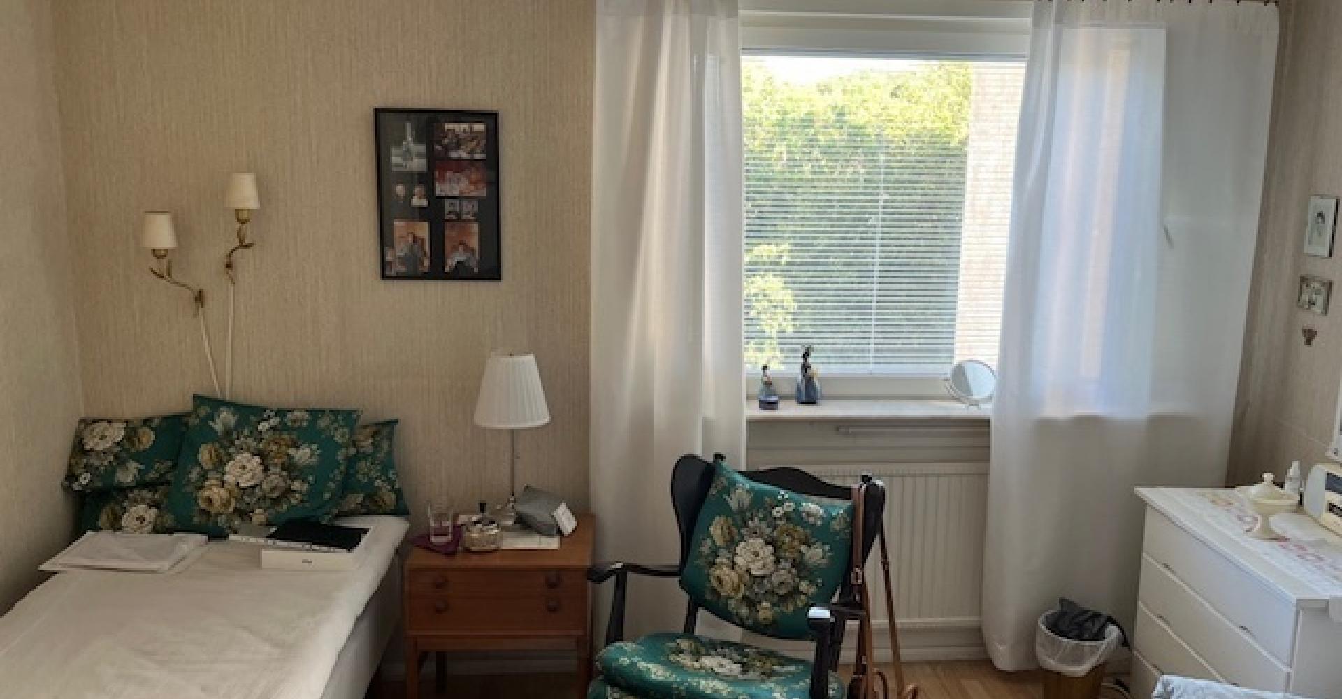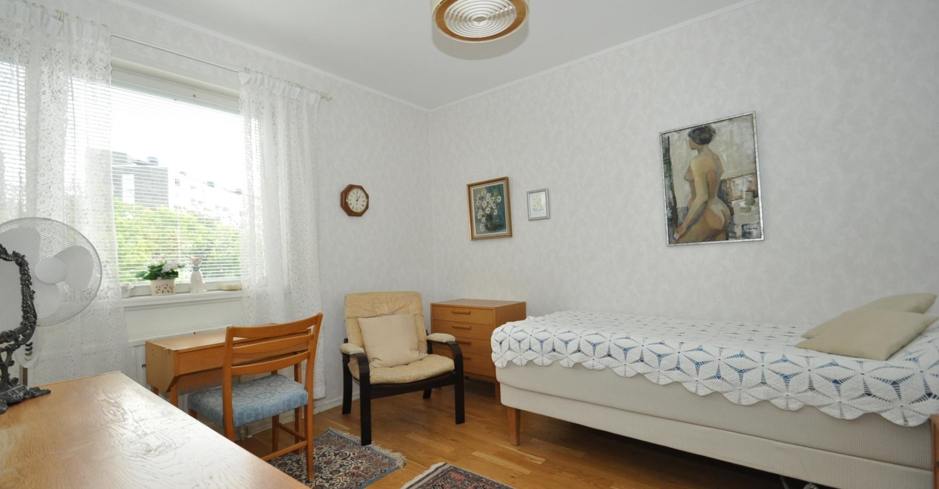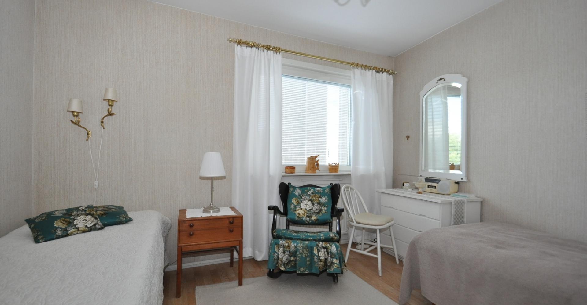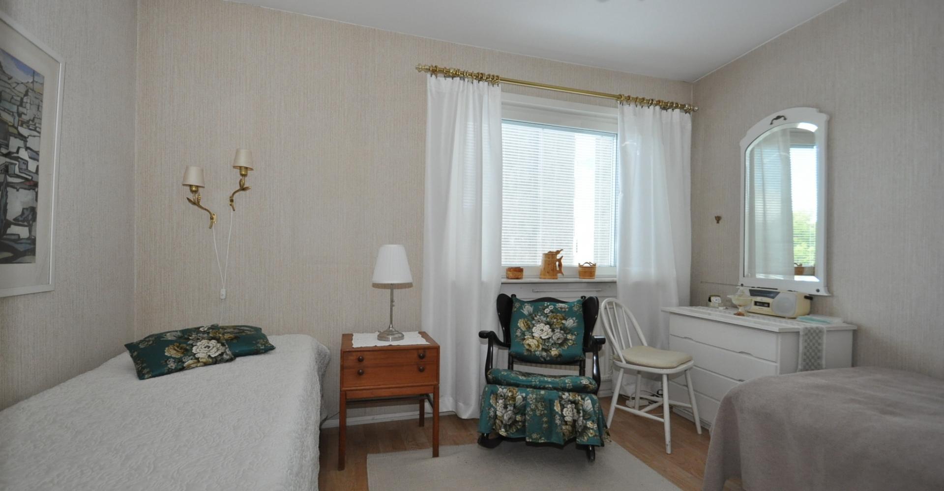 Sovrum: ljusa tapeter, persienner, parkettgolv