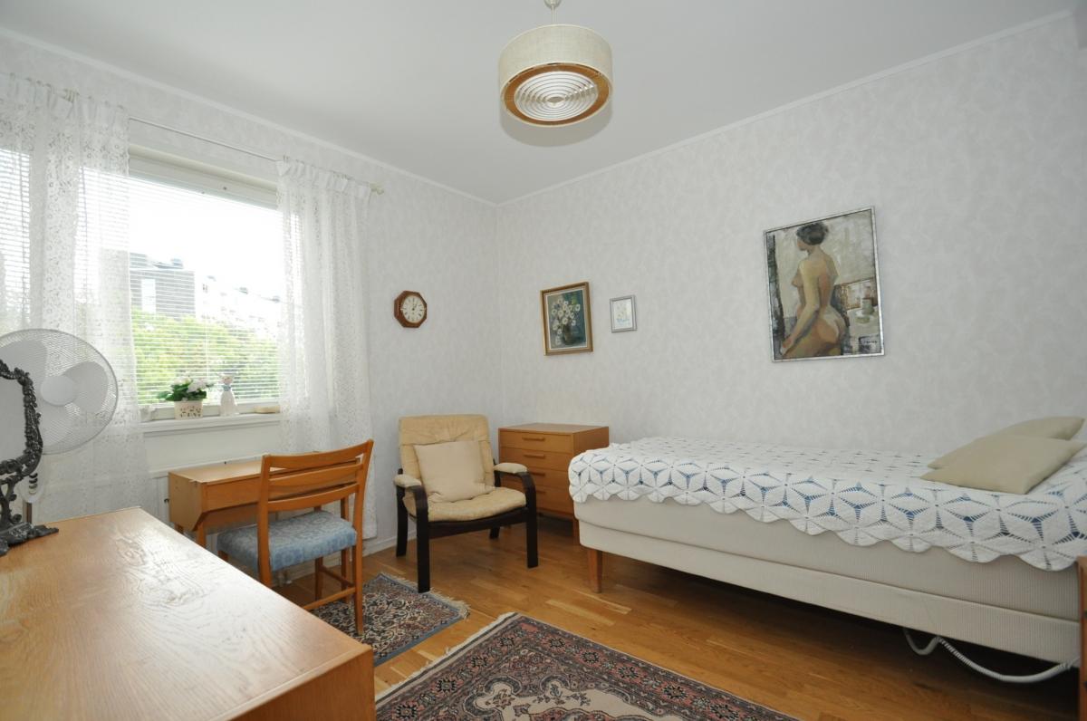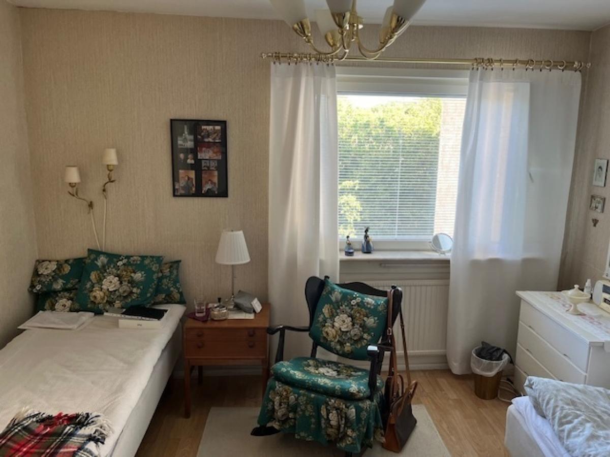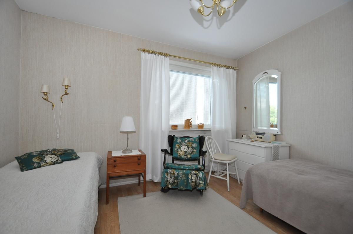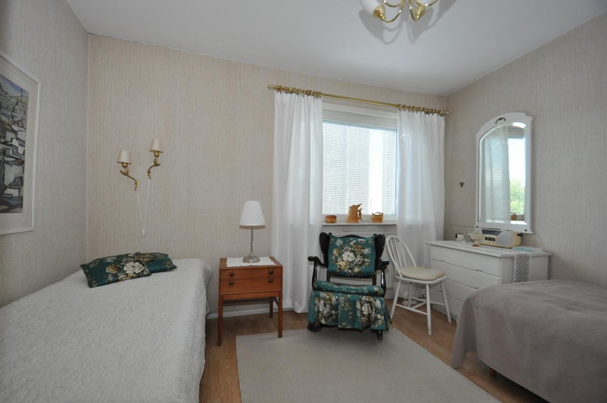 Sovrum: ljusa tapeter, persienner, parkettgolv