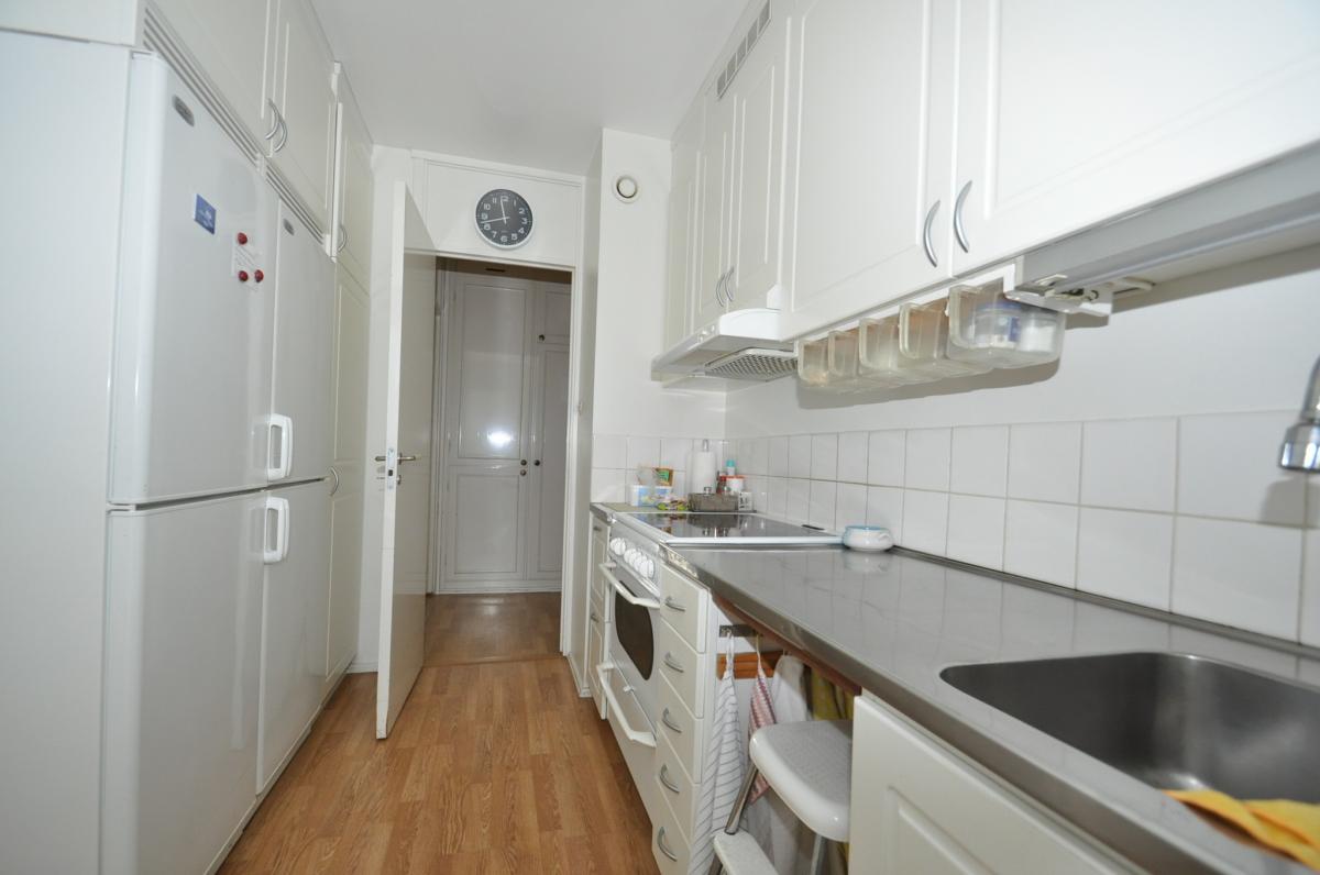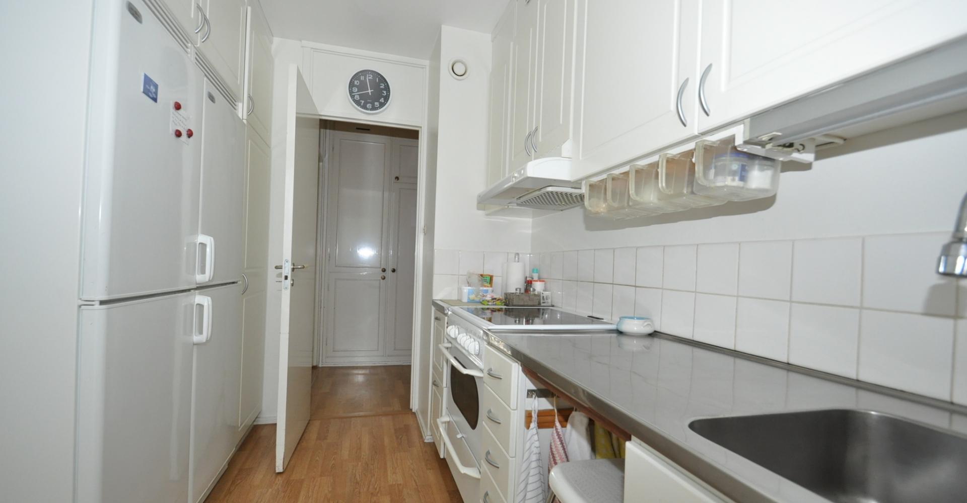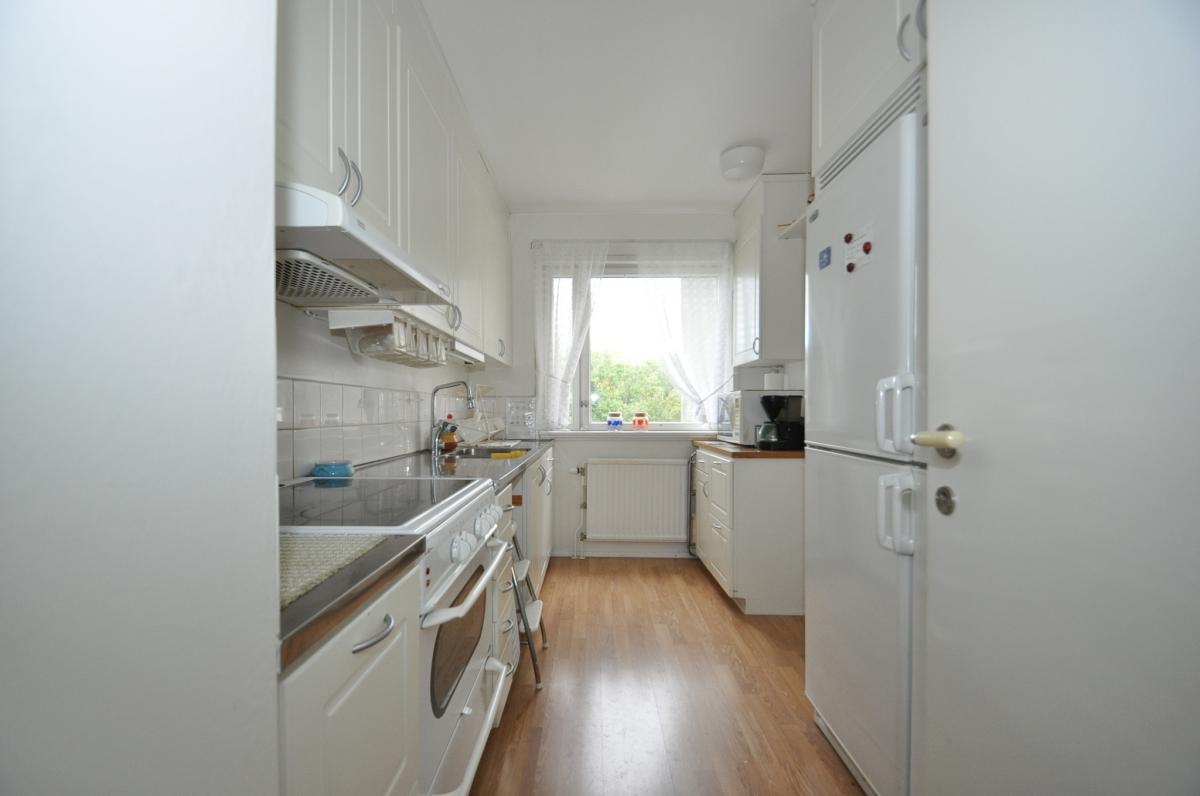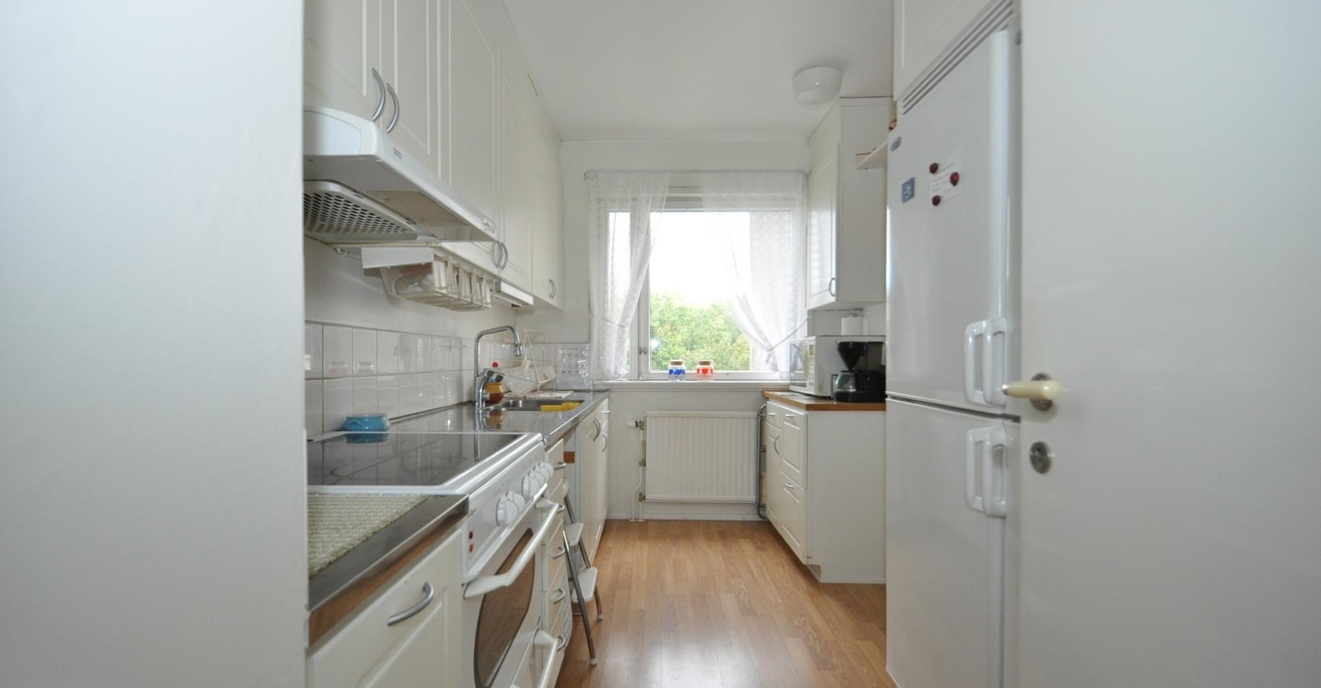 Kök: spis med häll och ugn, köksfläkt, kyl, frys, parkettgolv, bra med förvaringsskåp, ljusa tapeter.