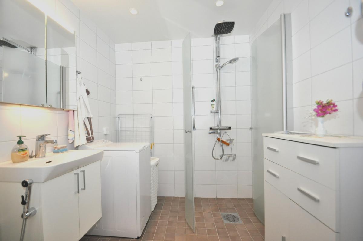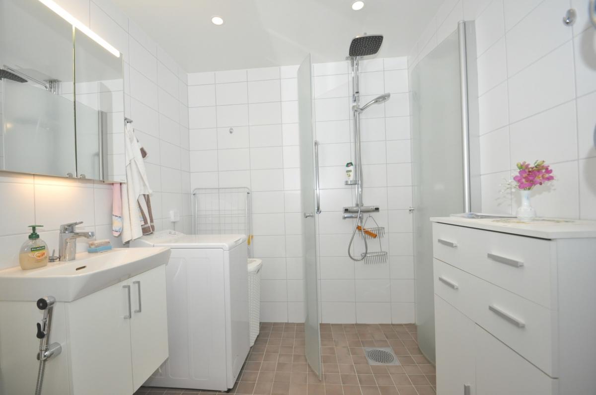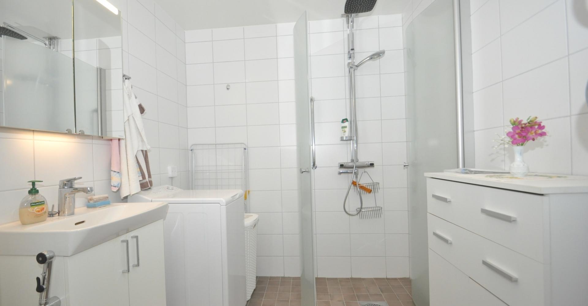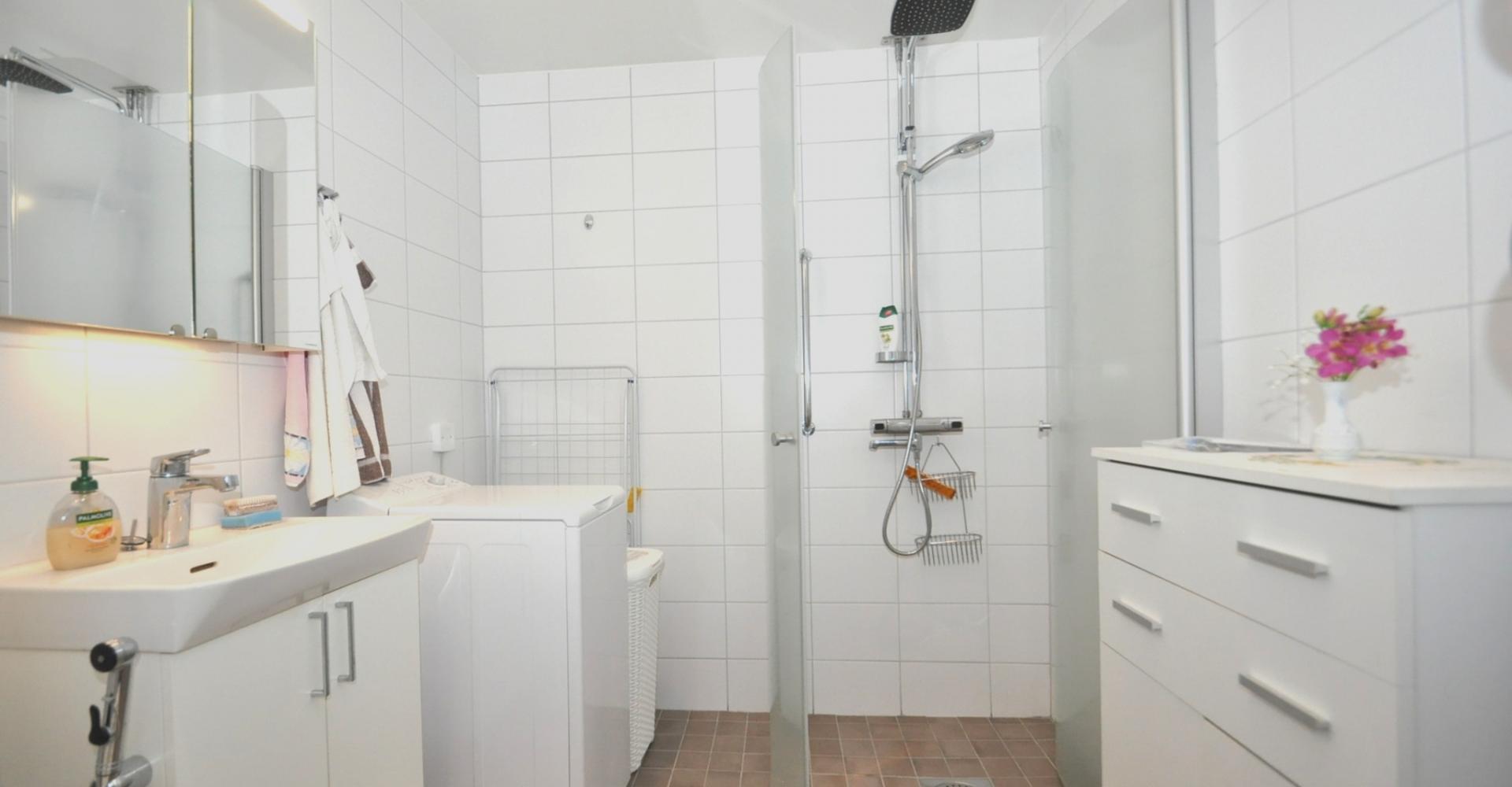 Badrum: handfat, badrumsskåp, dusch med vikväggar, tvättmaskin, kaklade väggar samt uppvärmt klinkergolv.