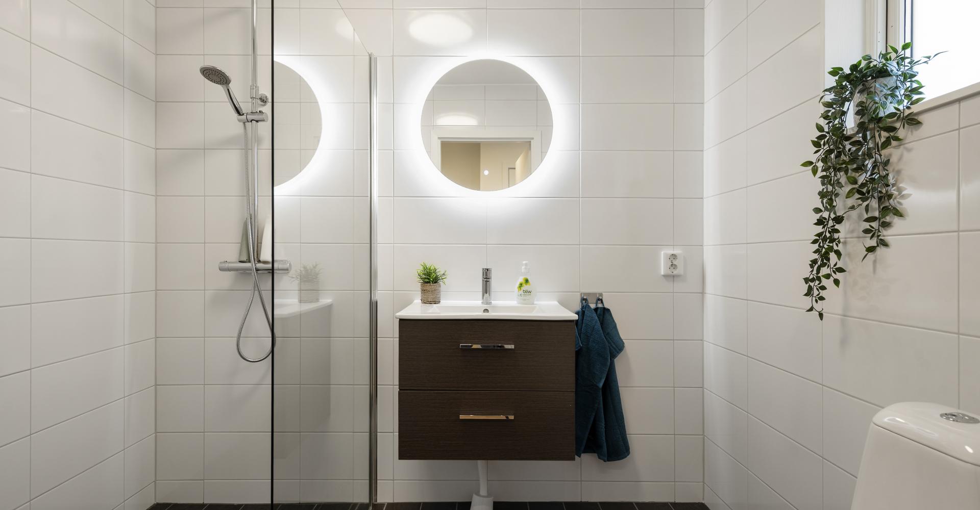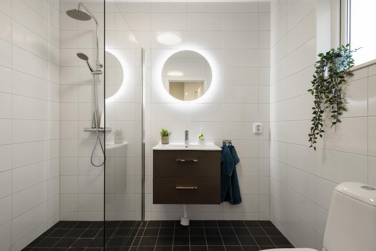 Badrummet är utrustat med w.c., kommod,, dusch med duschväggar samt spegel med belysning.