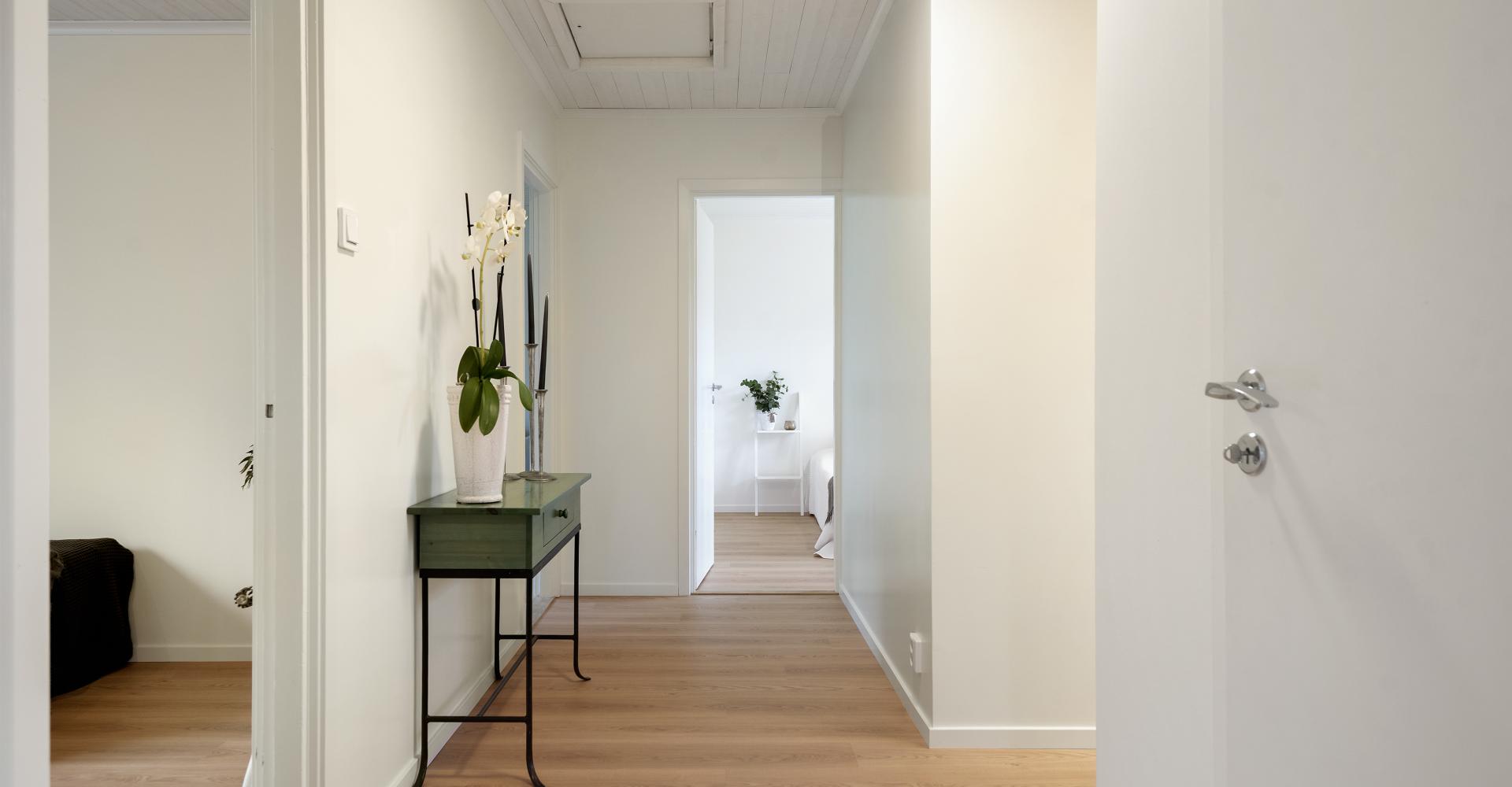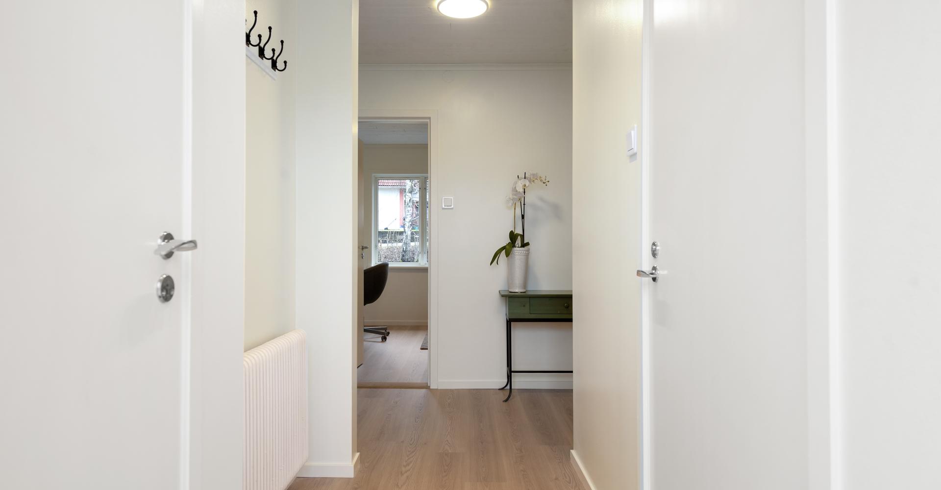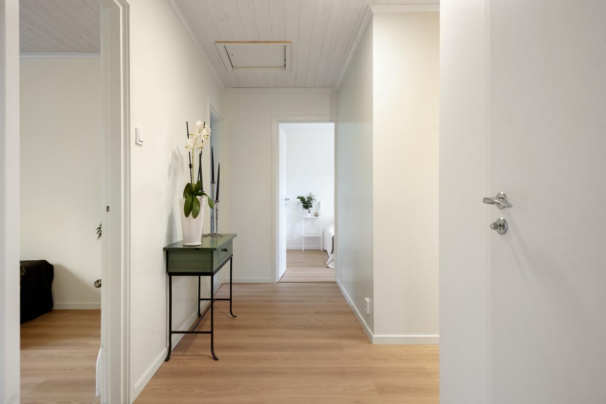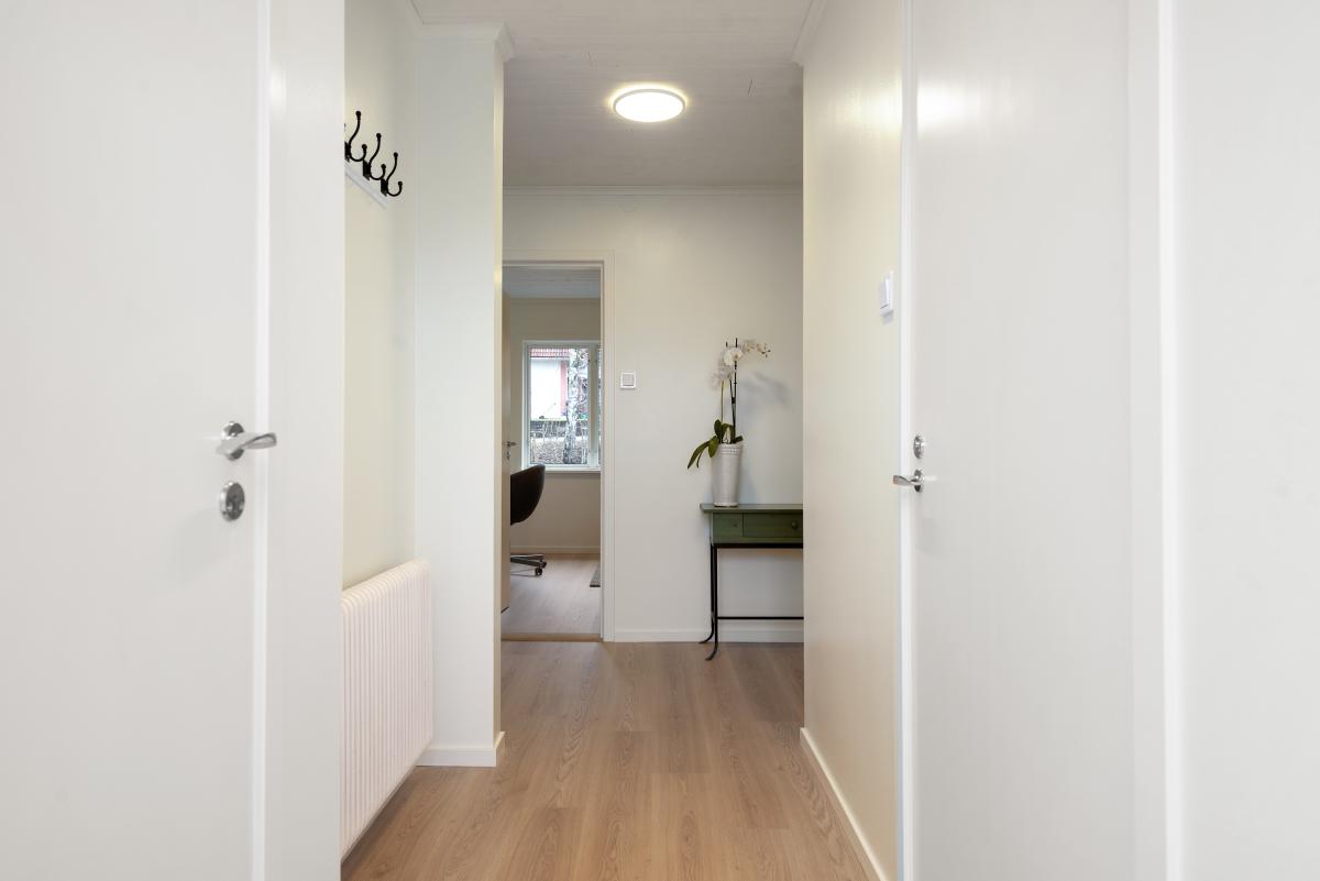 Hall mot sovrum och vardagsrum