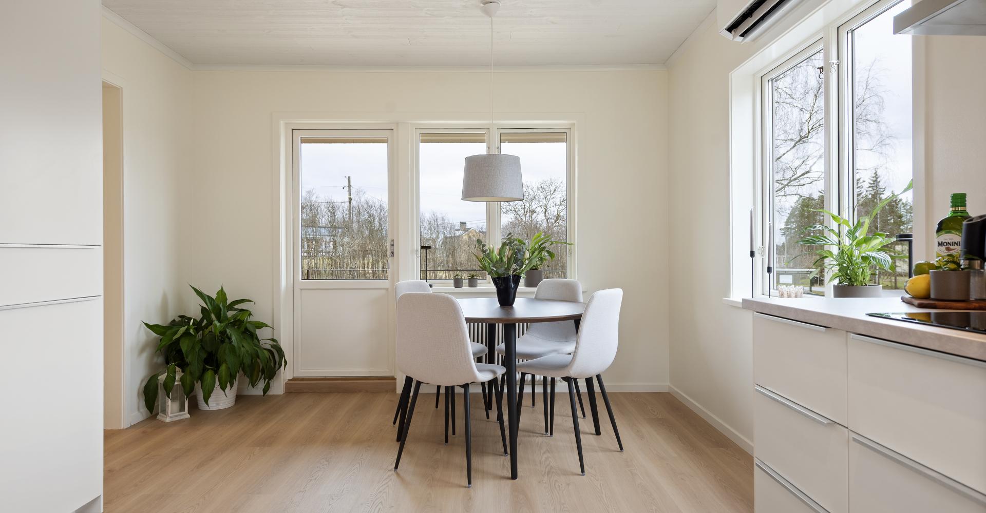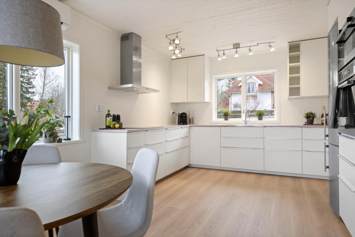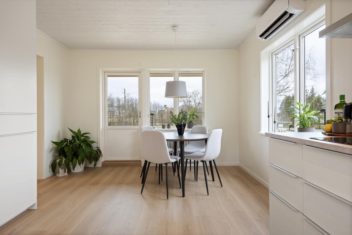 Kök från Ikea med laminatgolv -25, målade väggar och tak -25, nya bänkskivor, luftvärmepump -23 samt utgång till altan.