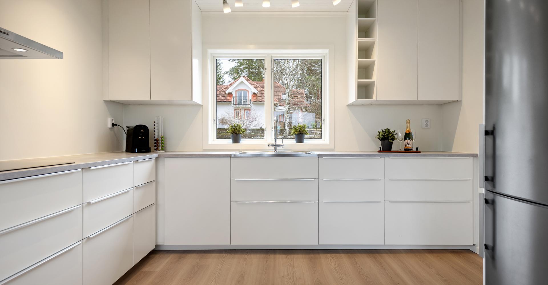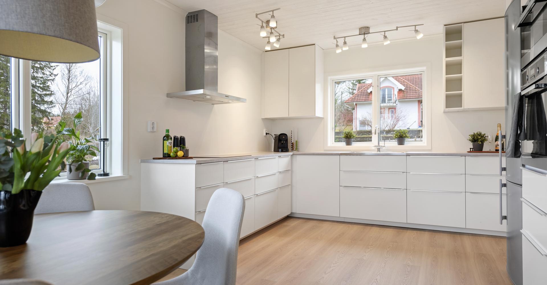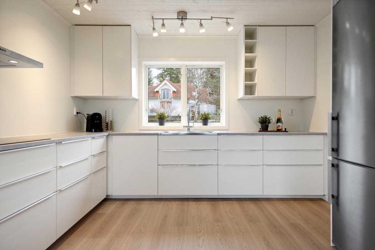 Kök från Ikea med laminatgolv -25, målade väggar och tak -25, nya bänkskivor, luftvärmepump -23 samt utgång till altan.