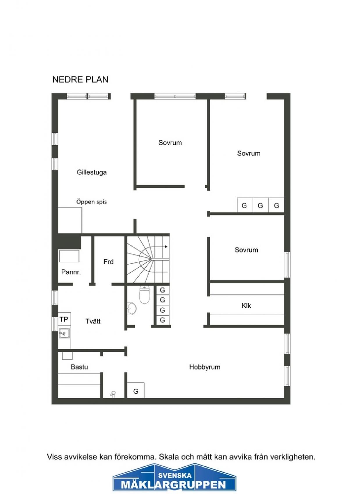 På souterrängplan finns den mysiga gillestugan med utgång till altan, här finns också tre rymliga sovrum varav ett har utgång till altanen. Här finns också stort hobbyrum, tvättstuga med maskiner från Miele, bastu med dusch, separat w.c. och förråd.