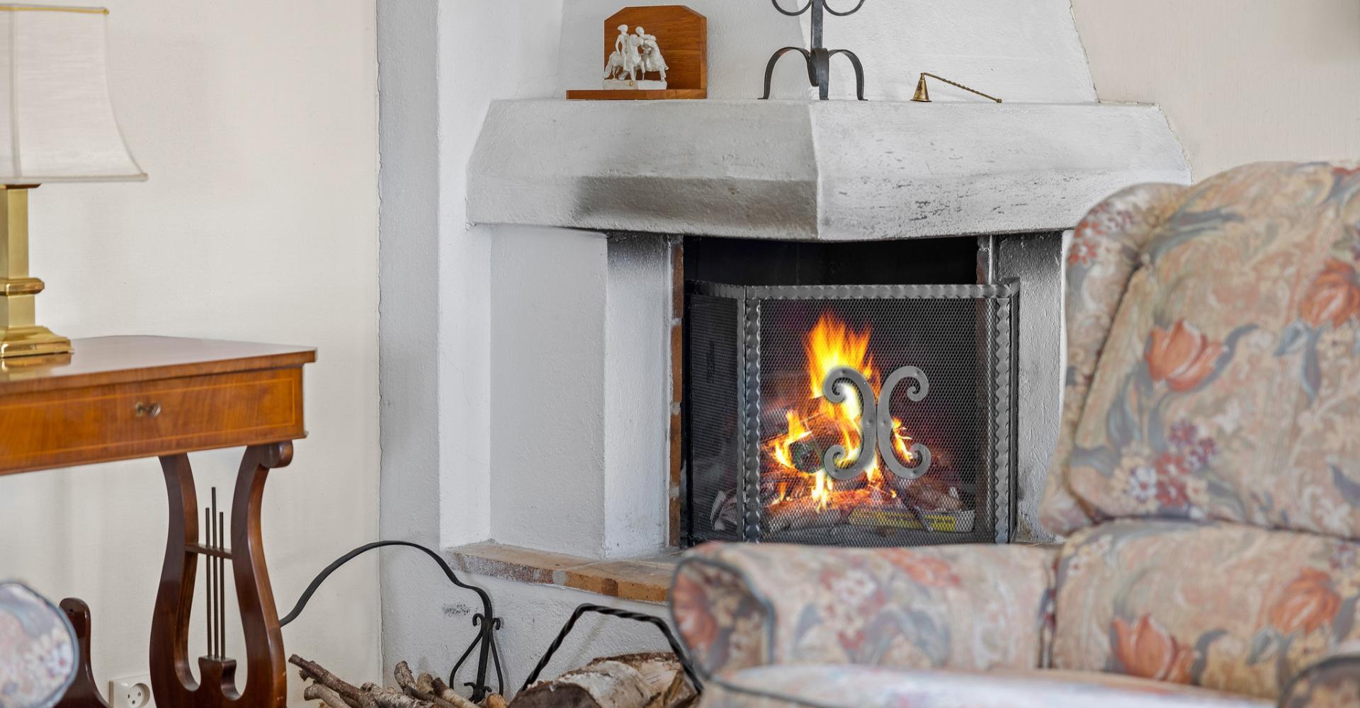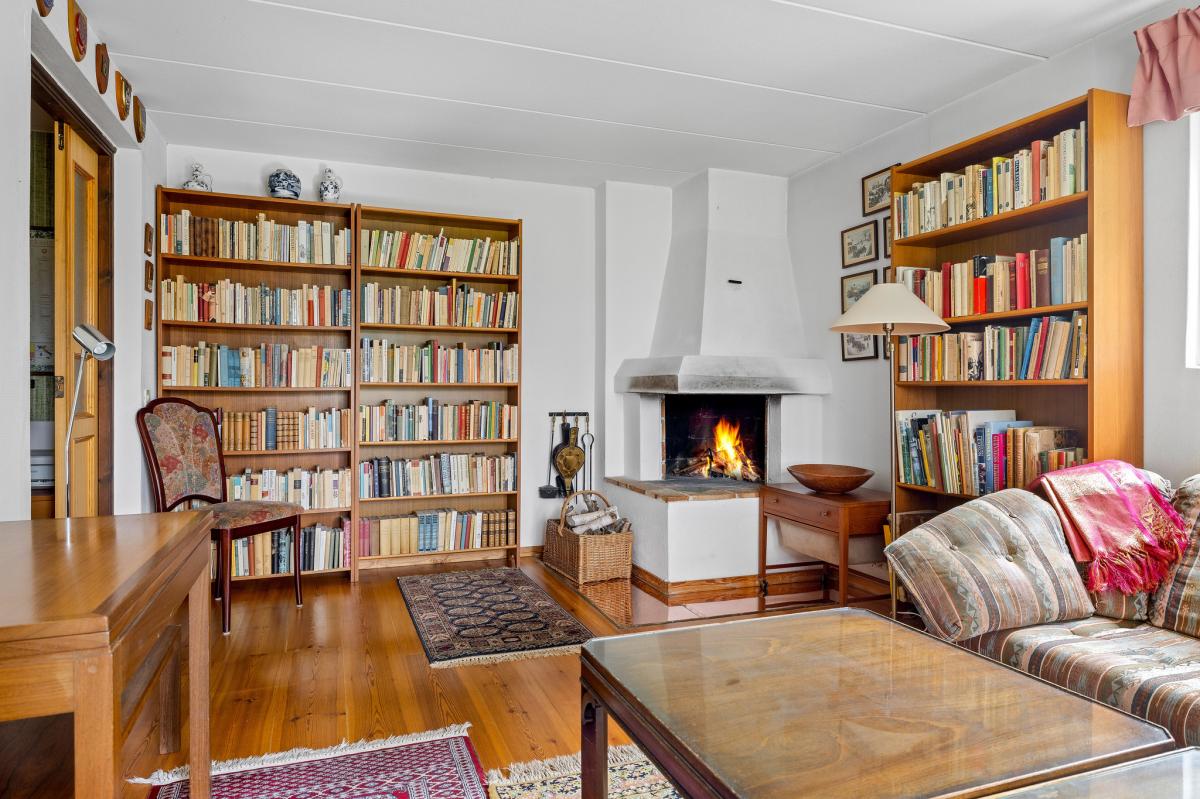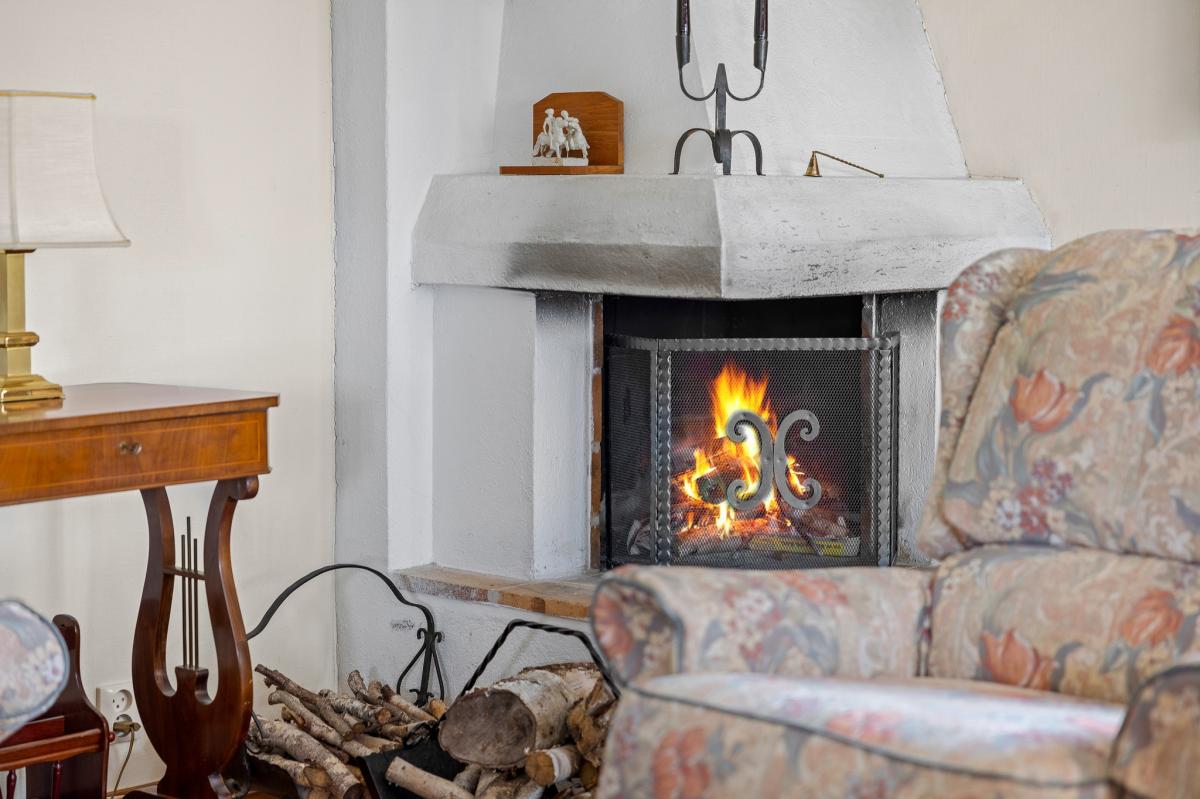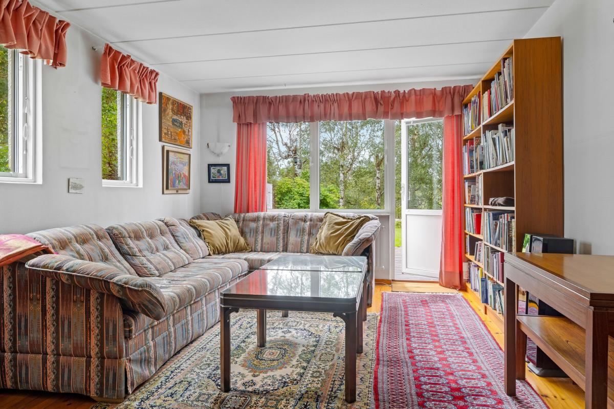 Gillestuga med trägolv, målad vävtapet, öppen spis samt utgång till altan.