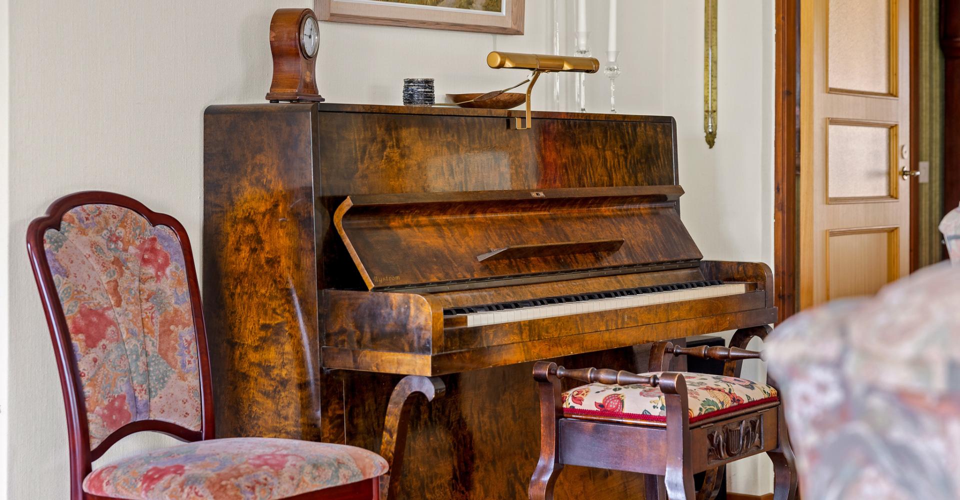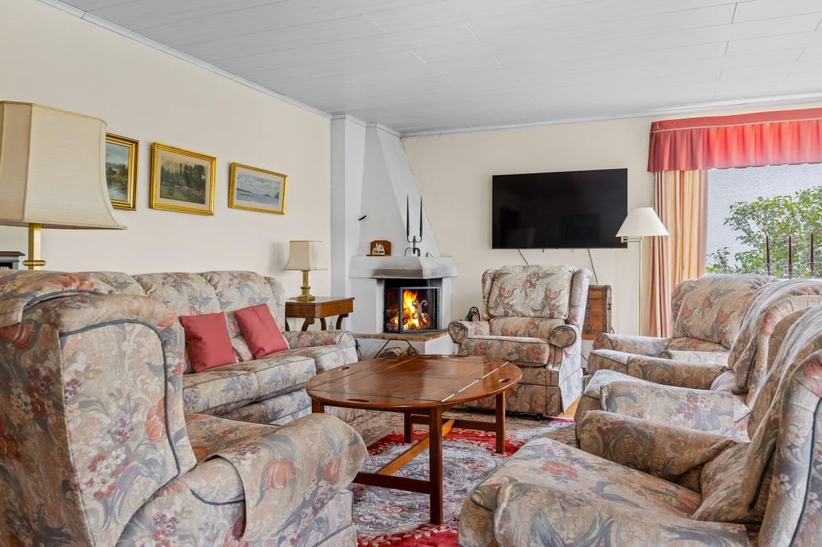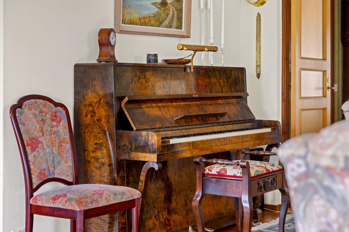 Gillestuga med trägolv, målad vävtapet, öppen spis samt utgång till altan.