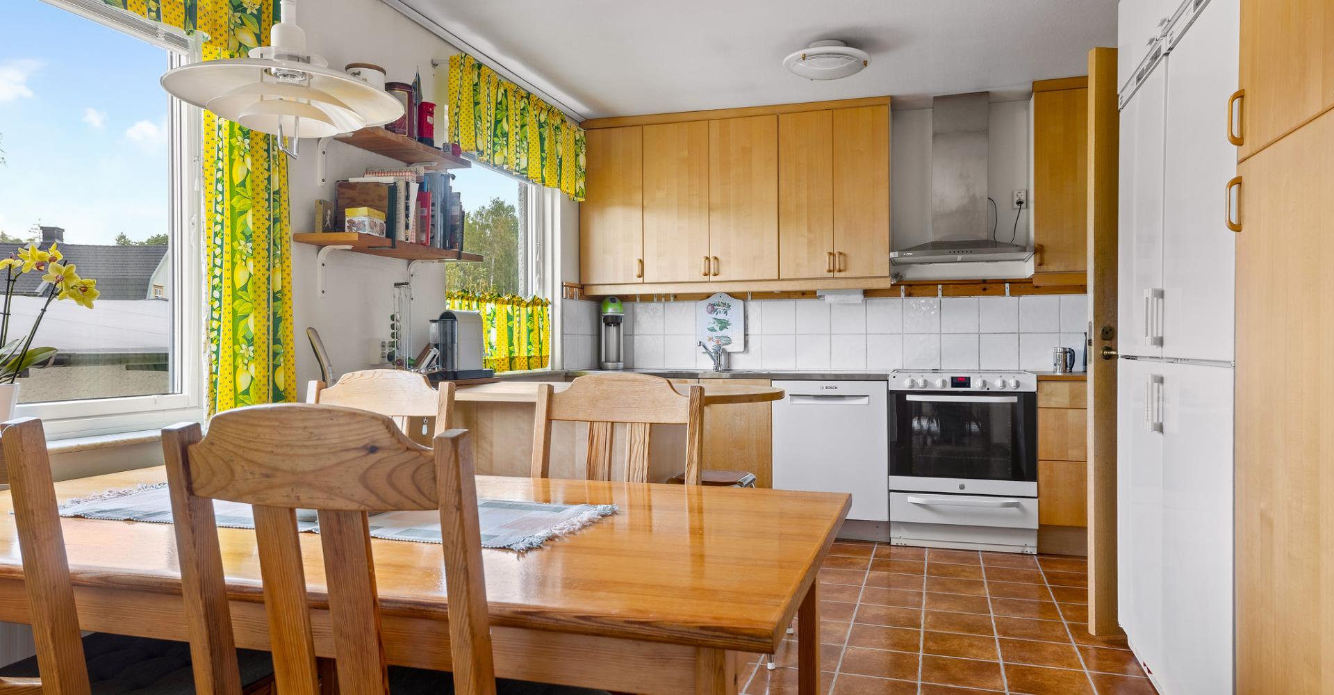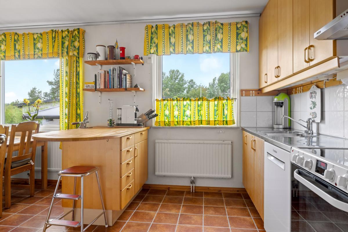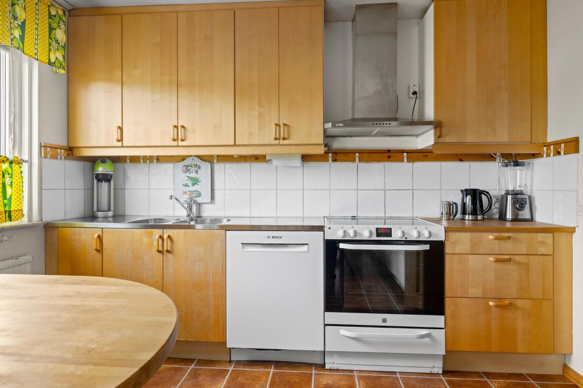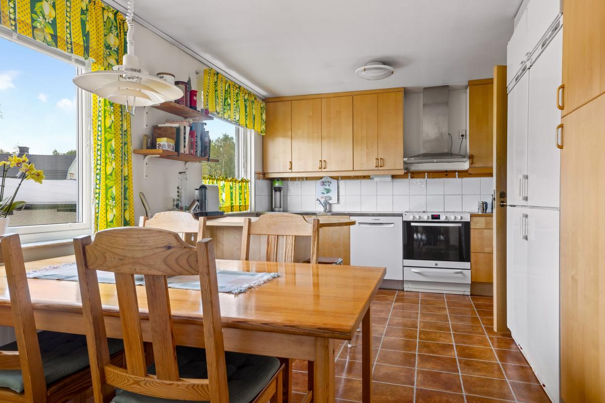 Köket är utrustat med spis med häll, spisfläkt, kyl/frys, kyl/frys samt diskmaskin.