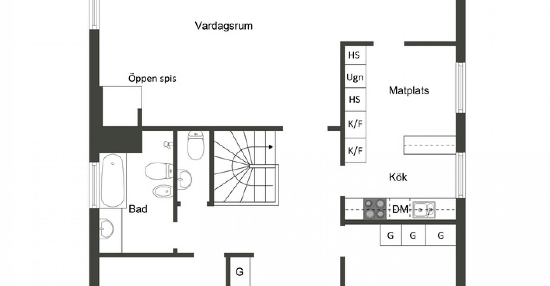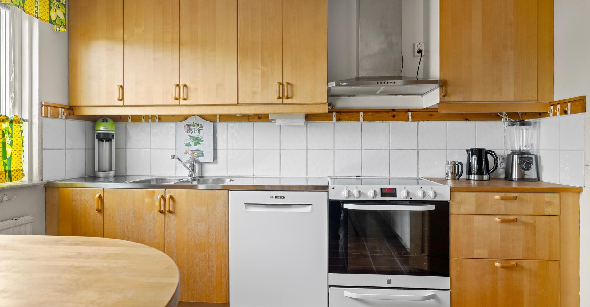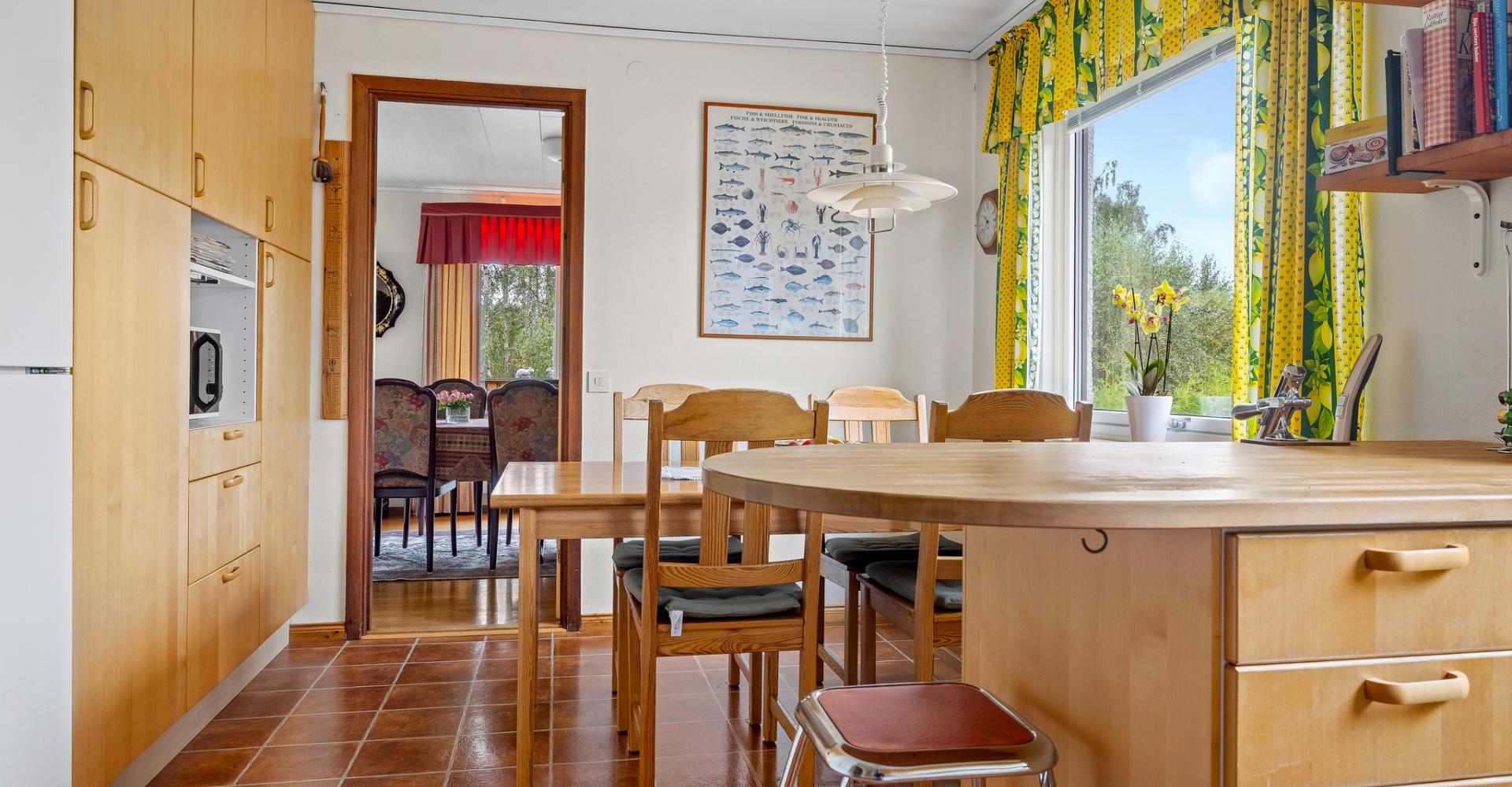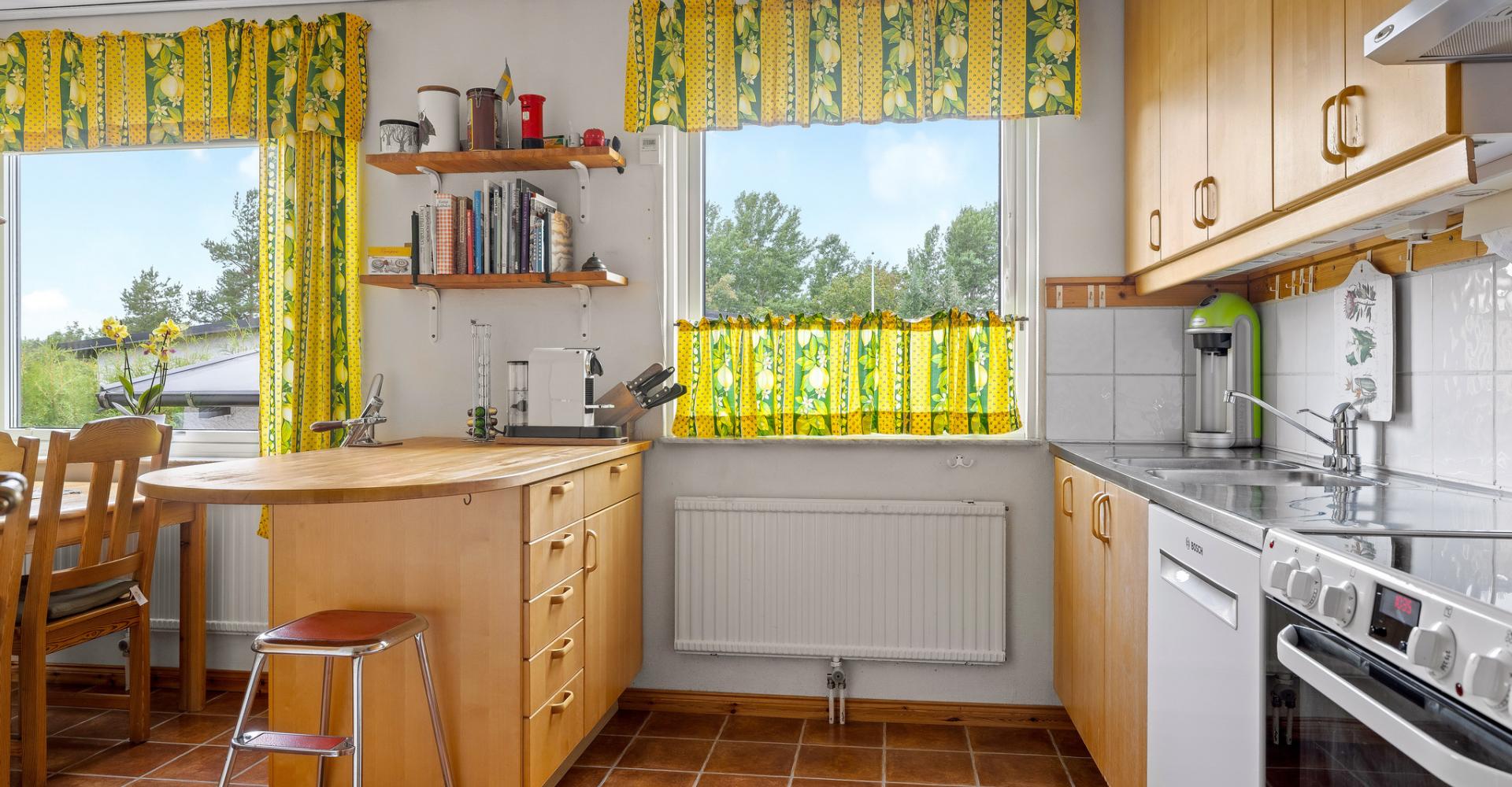 Köket är utrustat med spis med häll, spisfläkt, kyl/frys, kyl/frys samt diskmaskin.