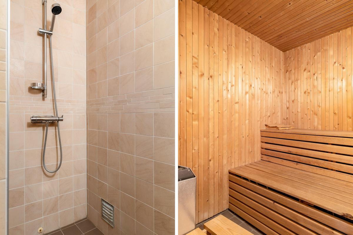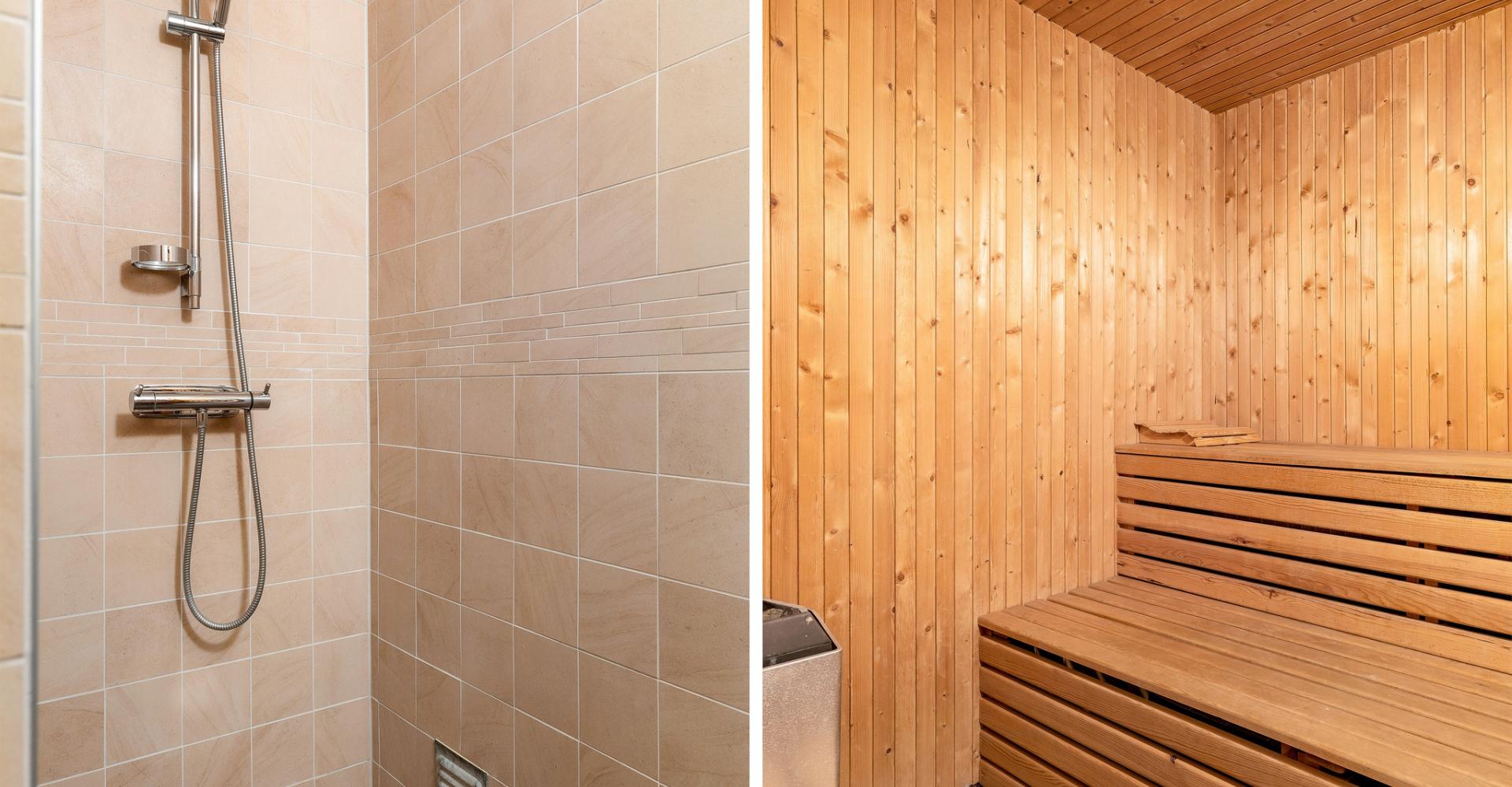 Bastu med klinkergolv samt träpanel, dusch i anslutning till bastun med klinkergolv samt helkaklade väggar.