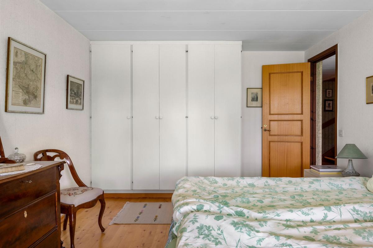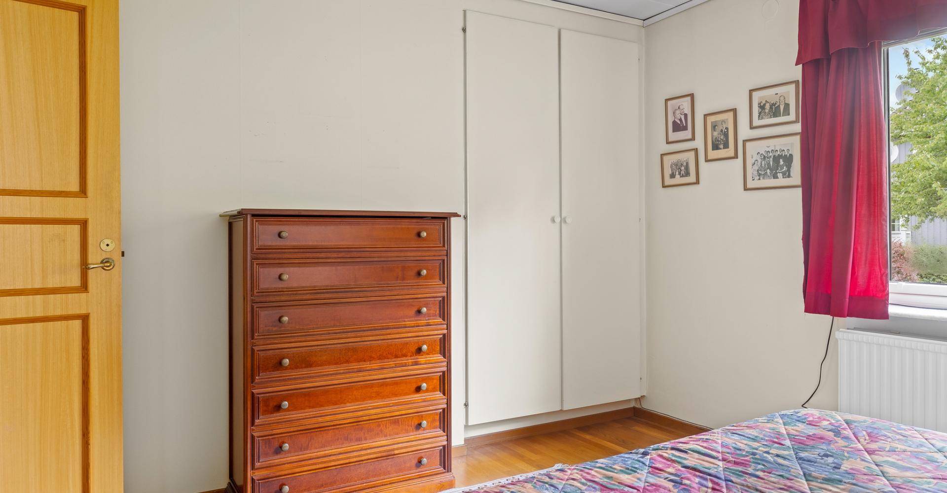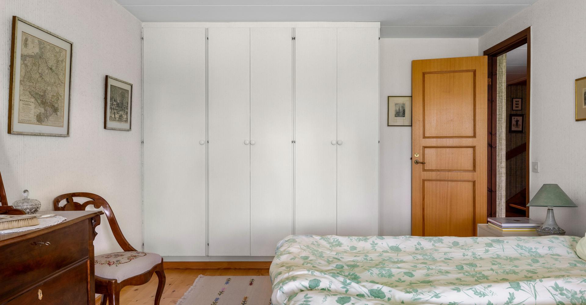 Sovrum med parkettgolv, tapet samt 3 garderober varav 2 dubbelgarderober.