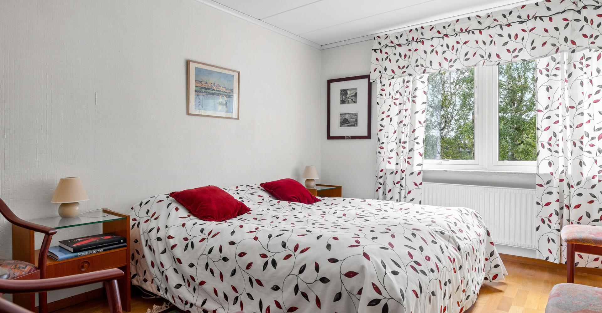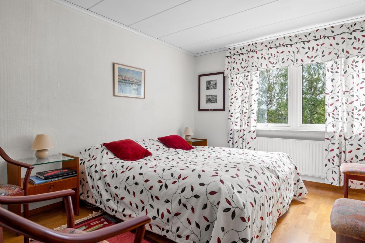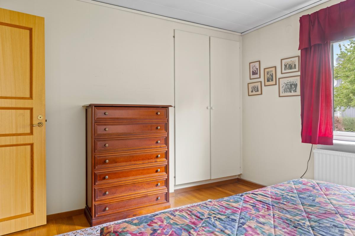 Sovrum med parkettgolv, tapet samt 3 garderober varav 2 dubbelgarderober.