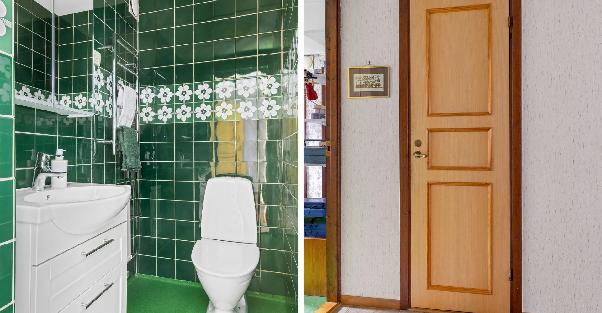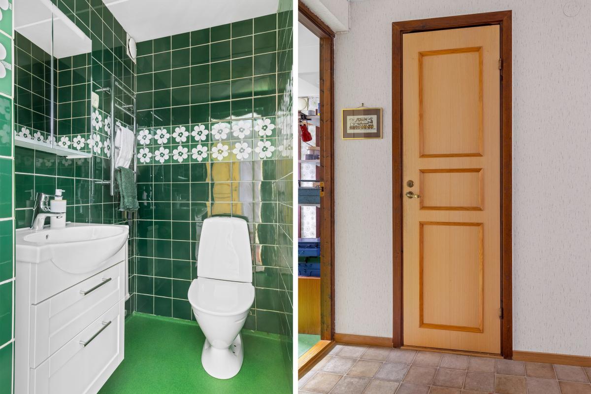 Gäst W.C. med plastmatta samt helkaklade väggar.