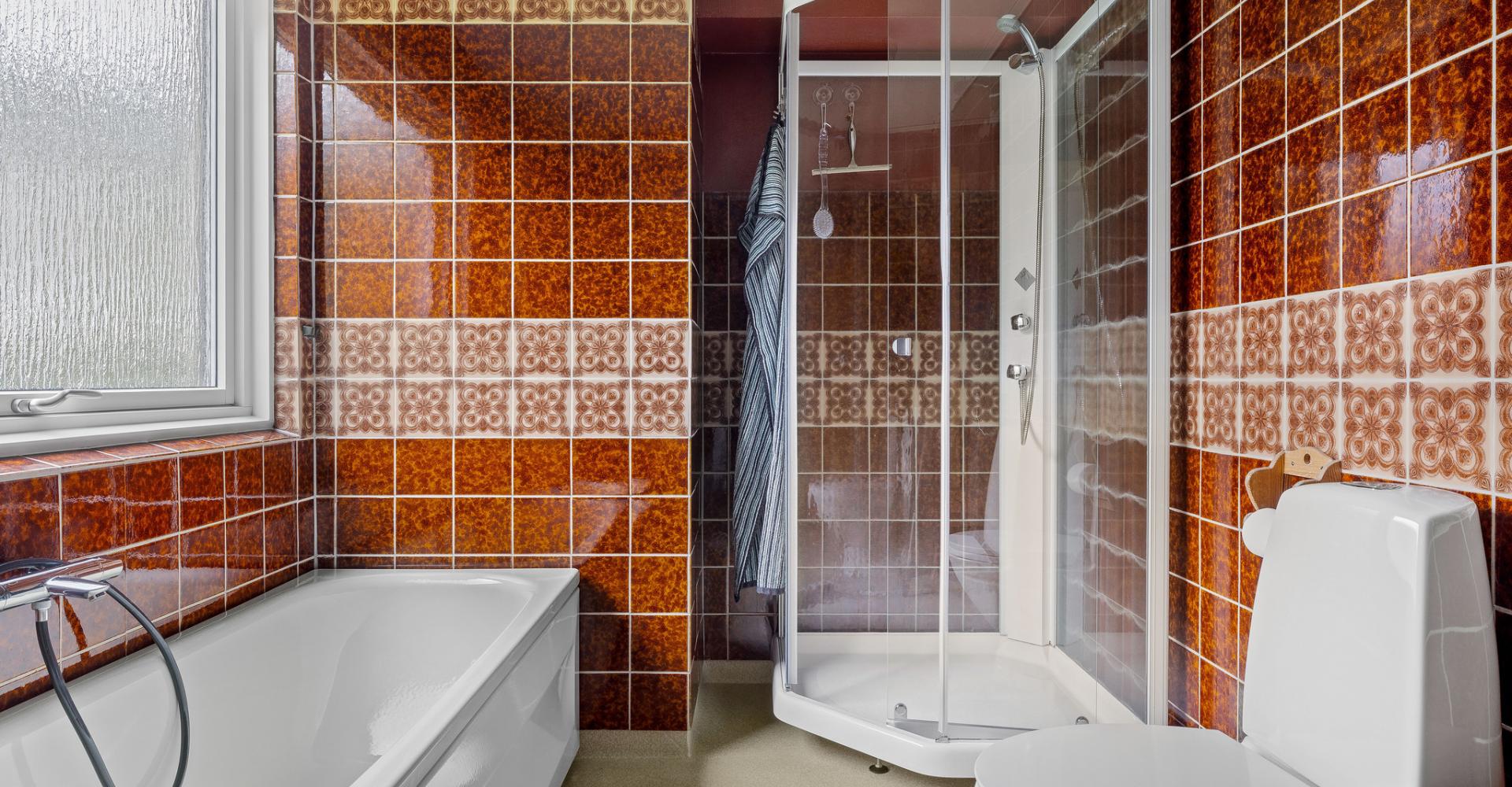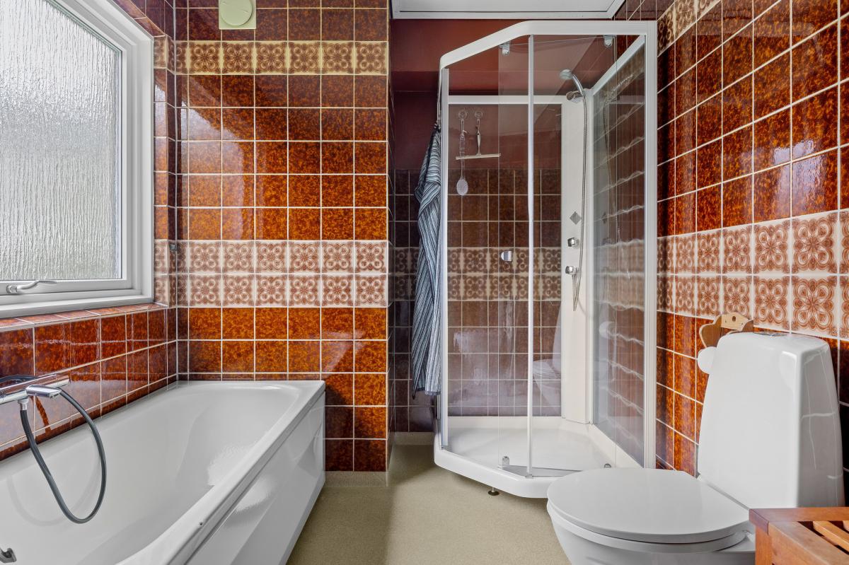 Badrummet är utrustat med w.c., handfat i kommod, badrumsskåp med belysning, duschkabin samt badkar.