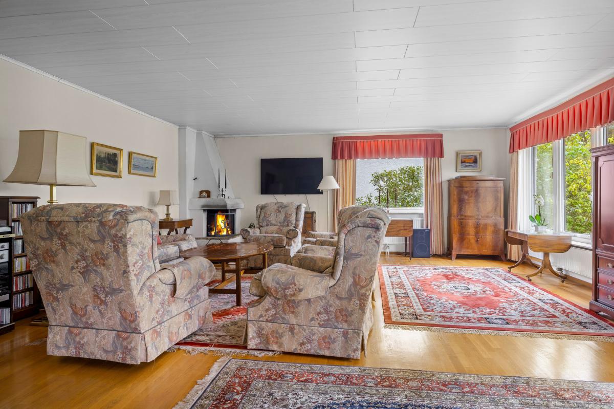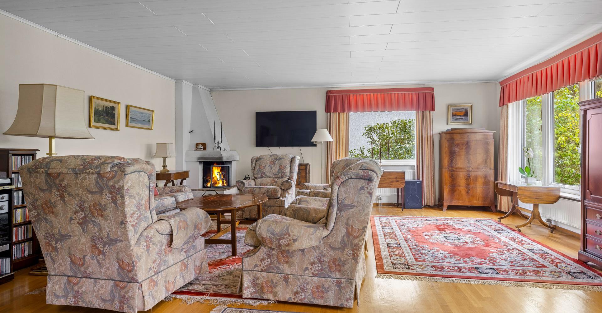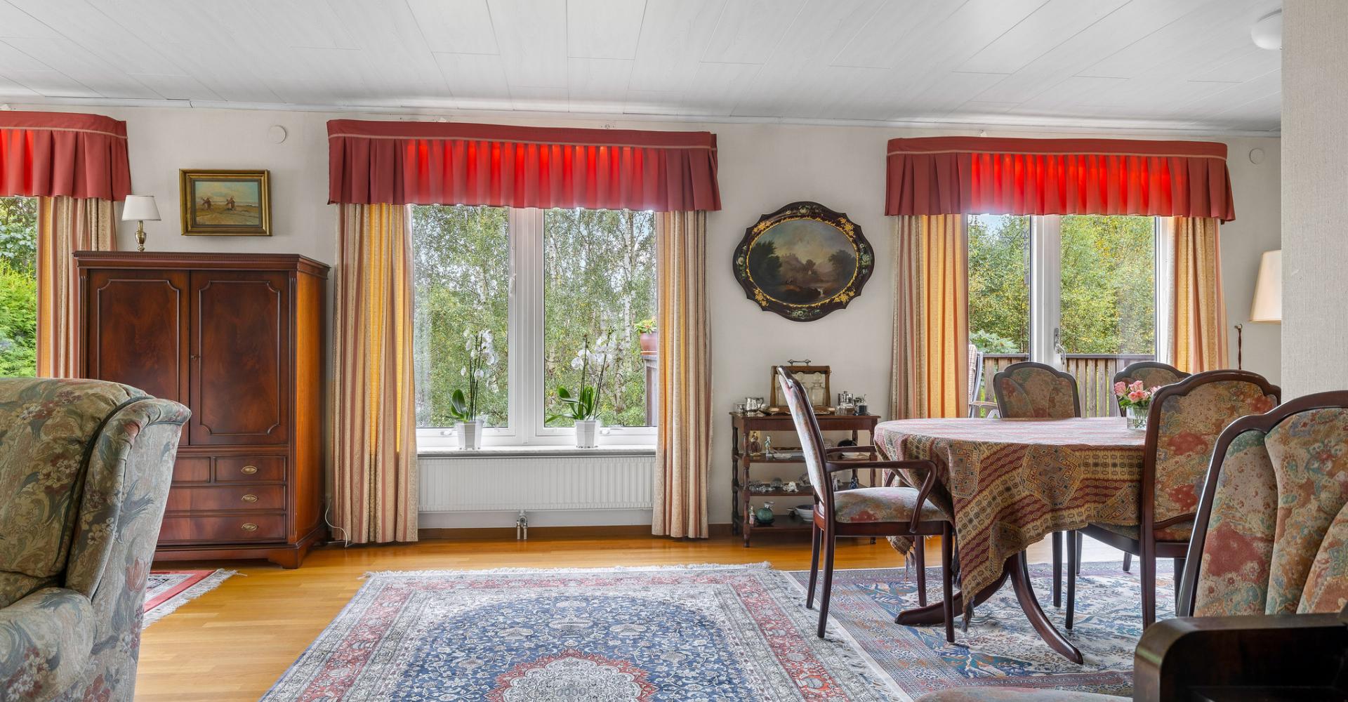 Vardagsrum med parkettgolv och stora fönsterpartier