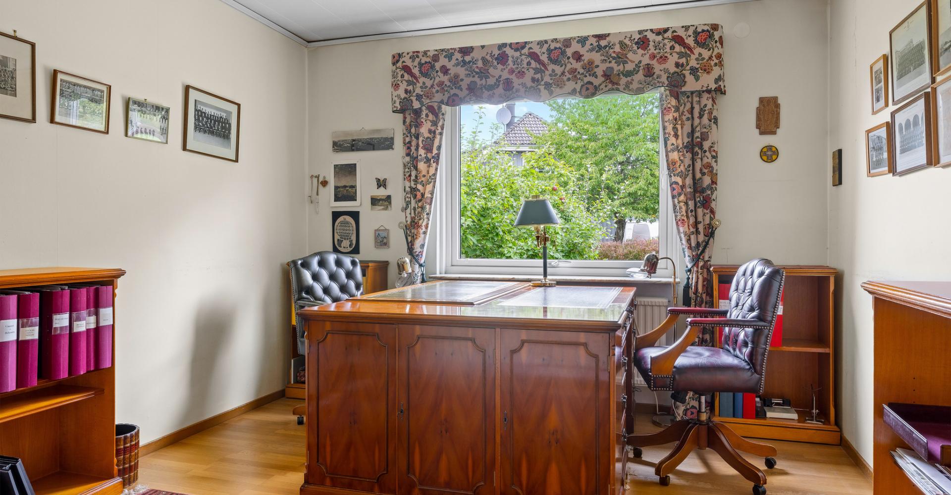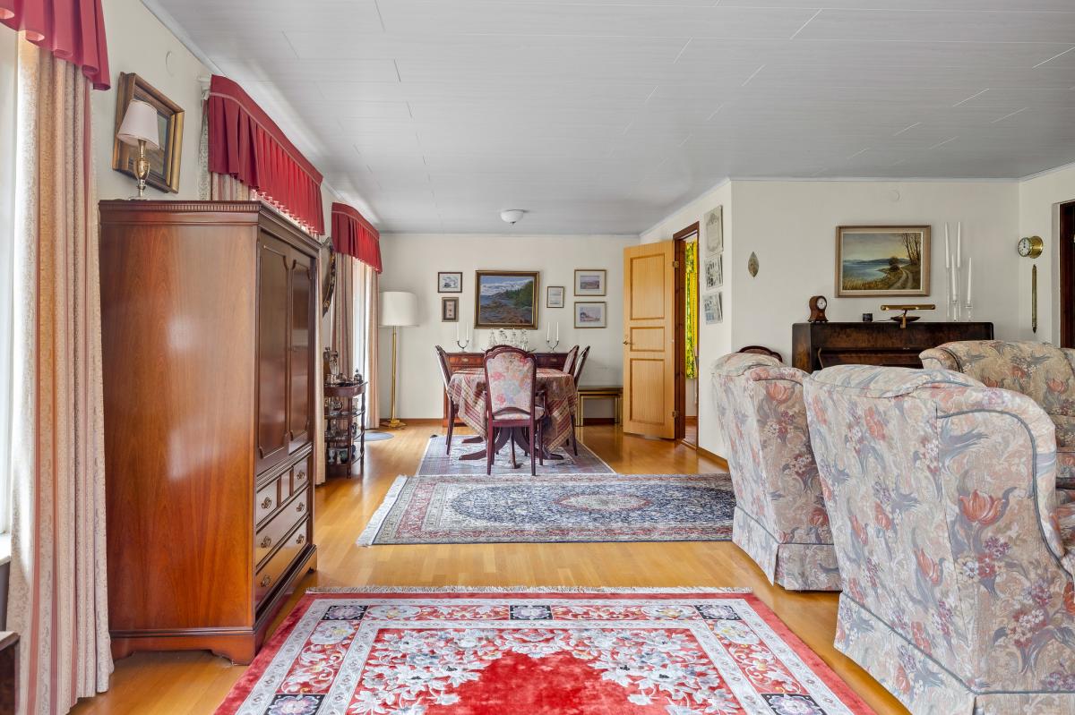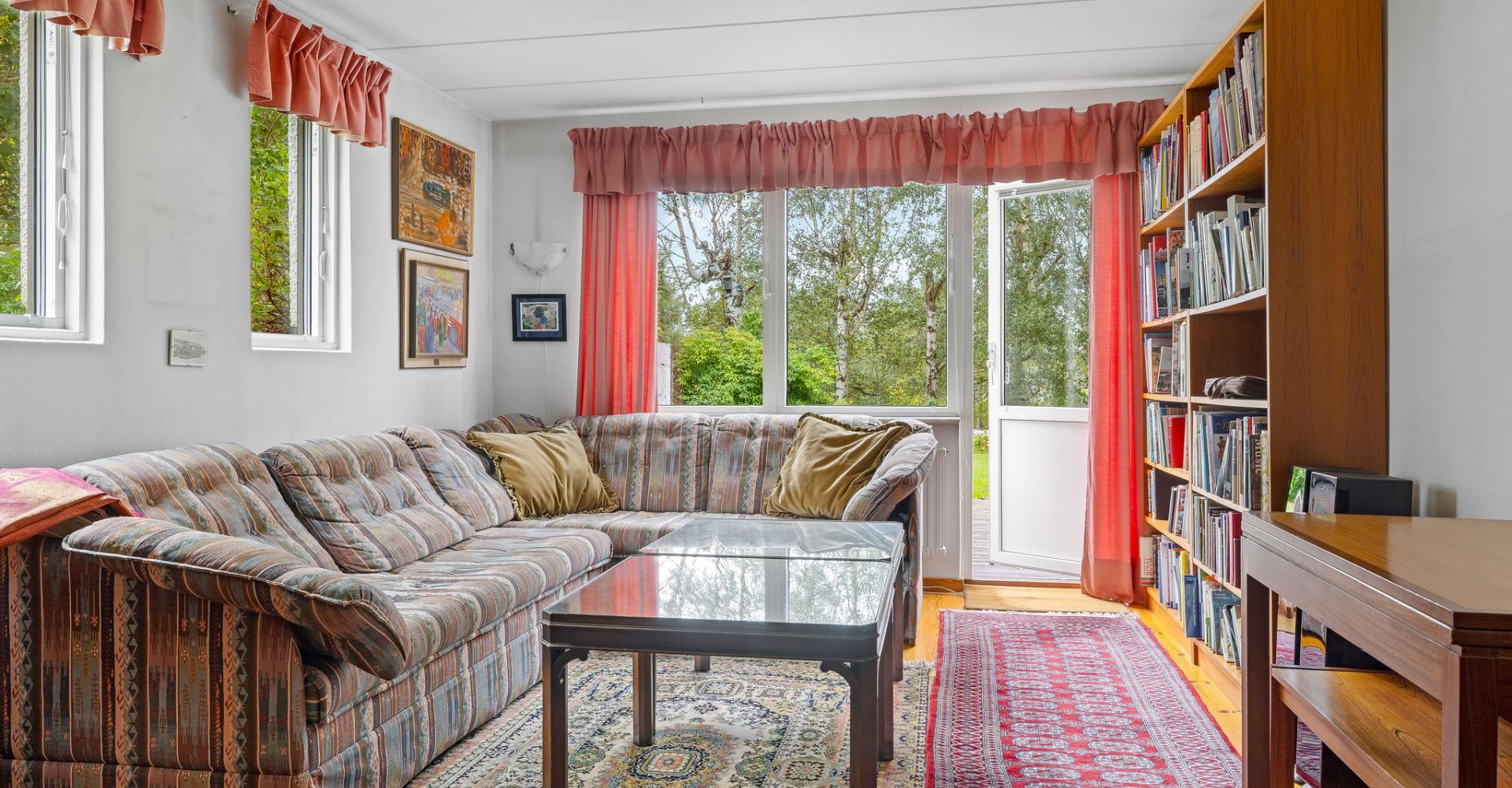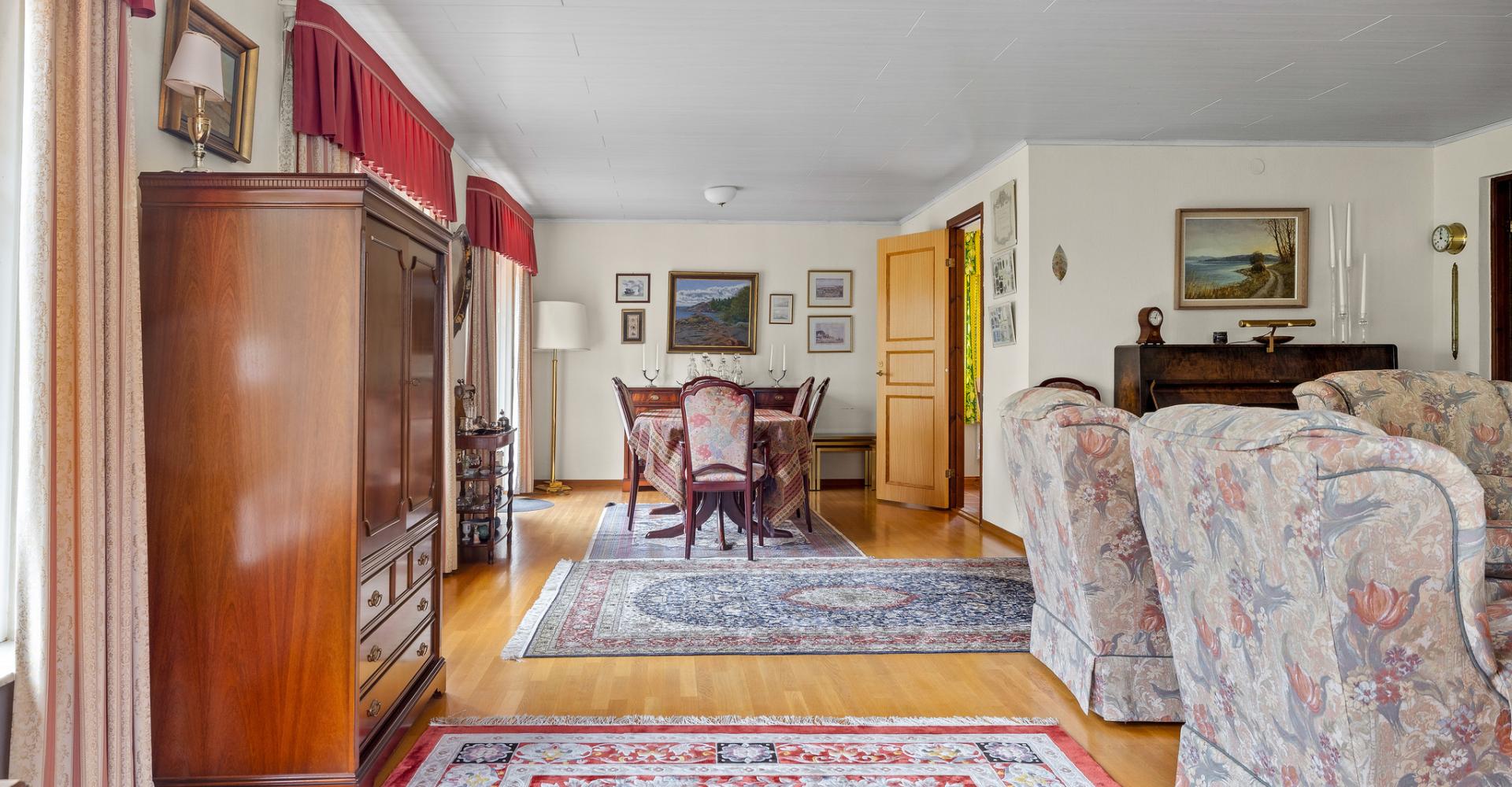 Vardagsrum med parkettgolv och stora fönsterpartier