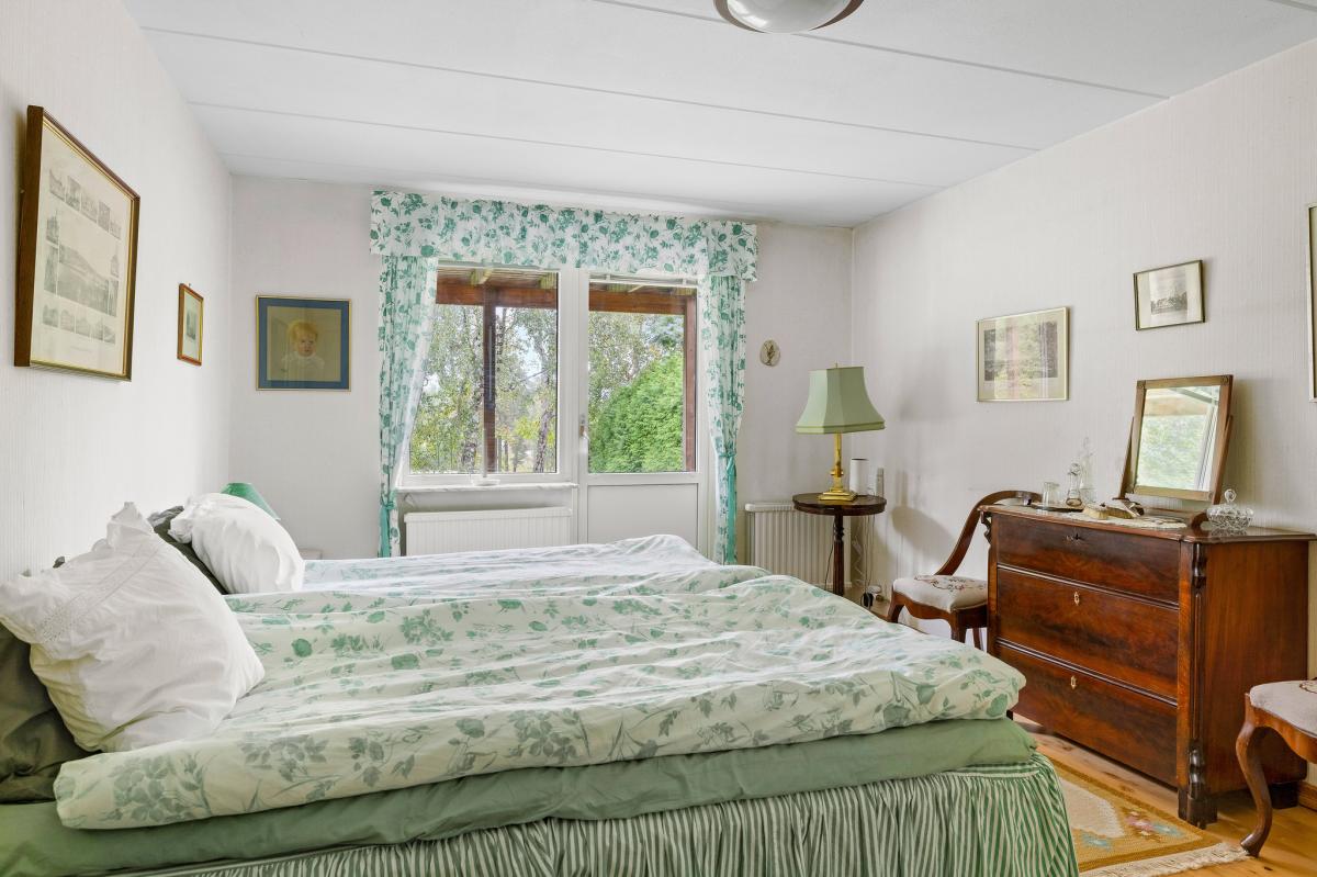Sovrum med laminatgolv, målad vävtapet samt 3 garderober varav 2 dubbelgarderob, utgång till altan.