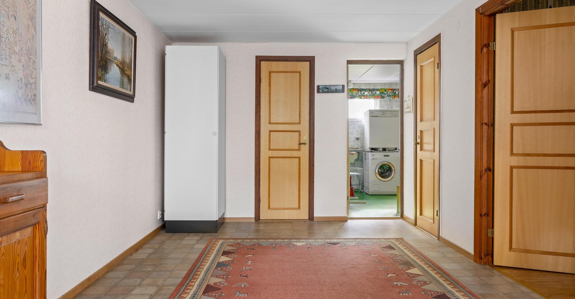 Hall med plastmatta, vävtapet, 3 garderober varav 1 dubbelgarderob.