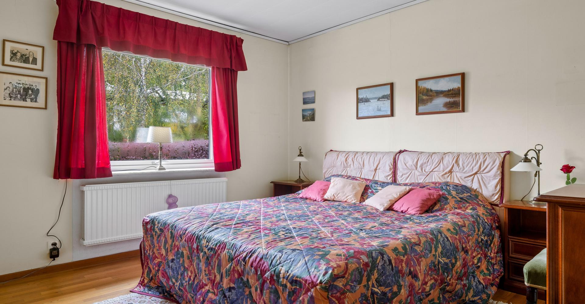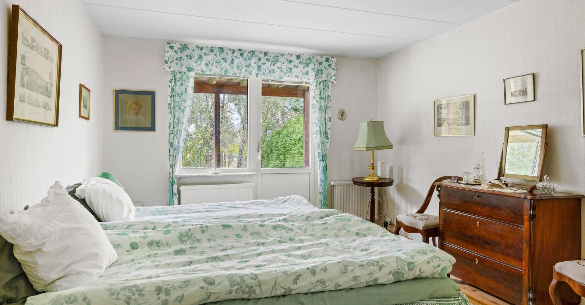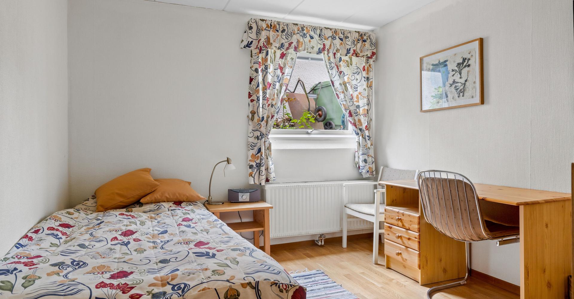 Sovrum med parkettgolv samt vitmålad vävtapet.