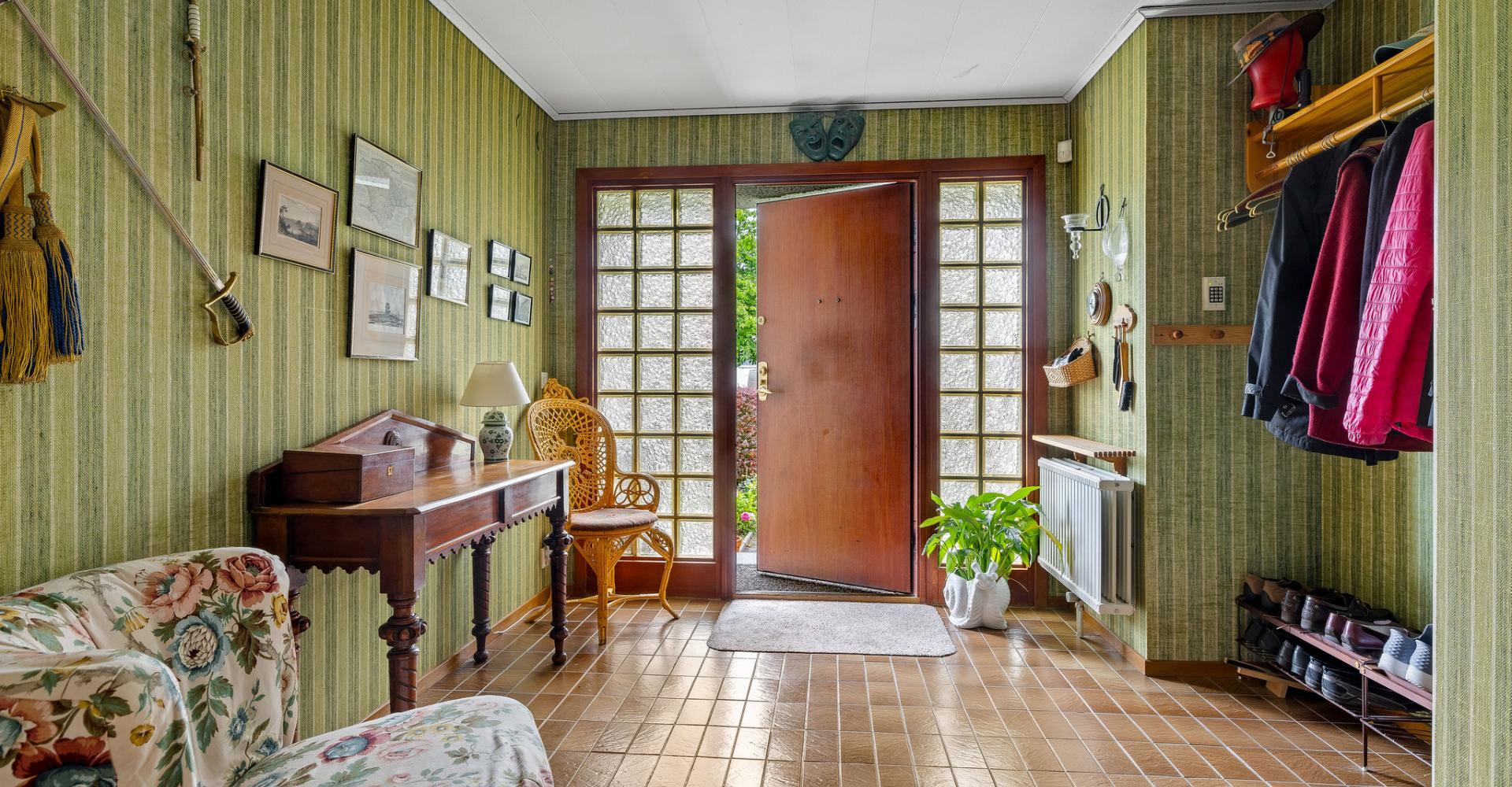 Hall med klinkergolv, vävtapet samt dubbelgarderob.