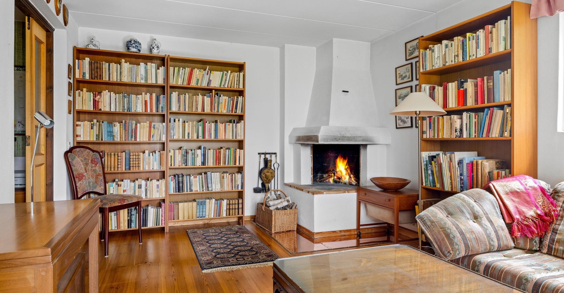 Vardagsrum med parkettgolv, målad vävtapet, öppen spis samt utgång till balkong.
